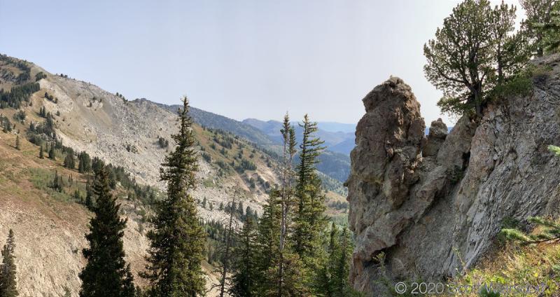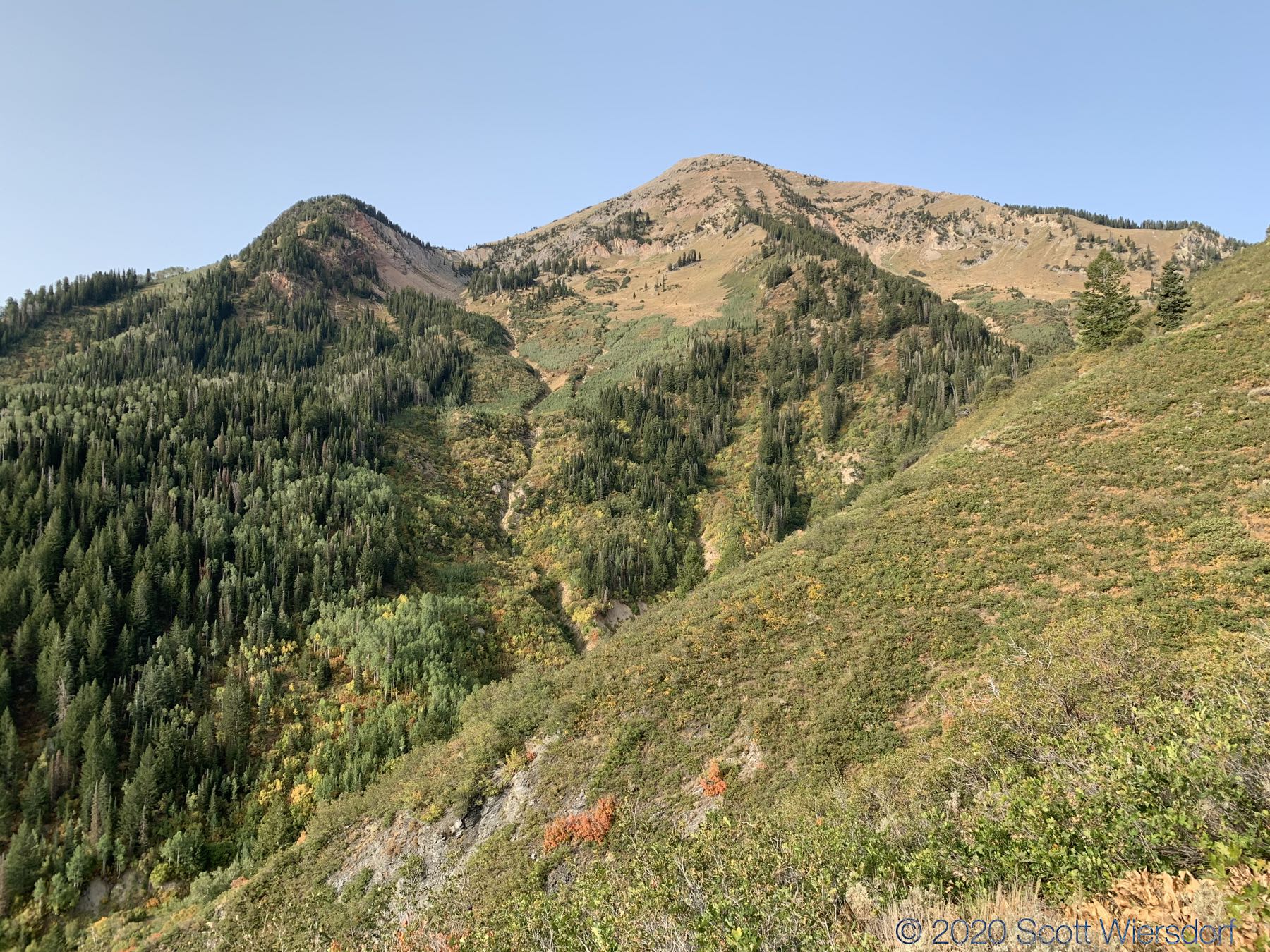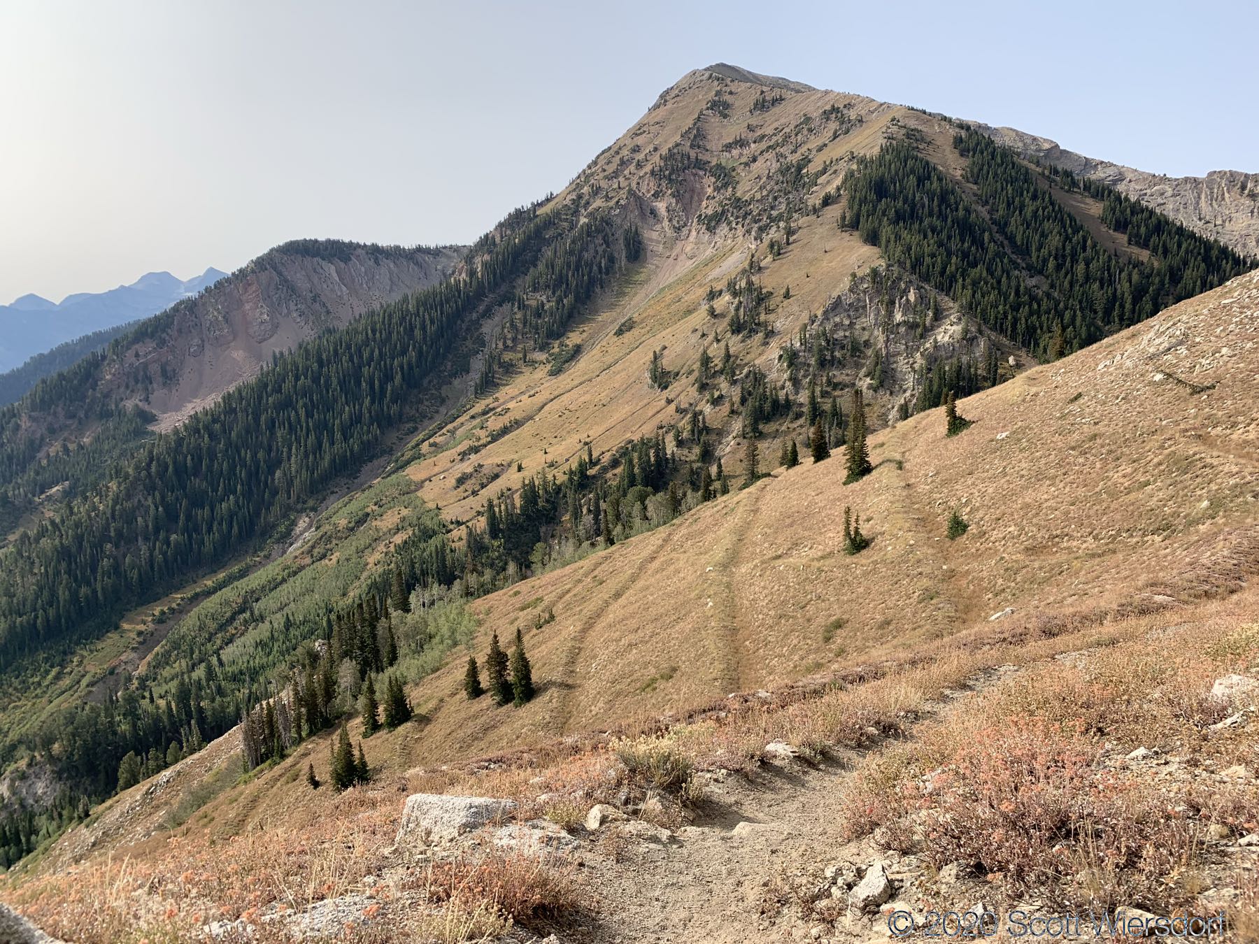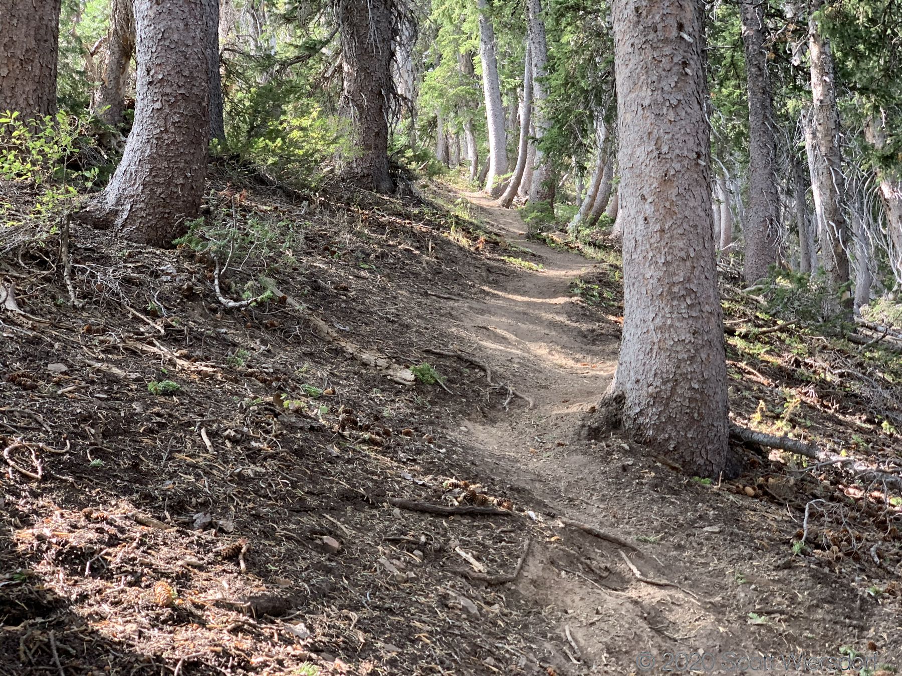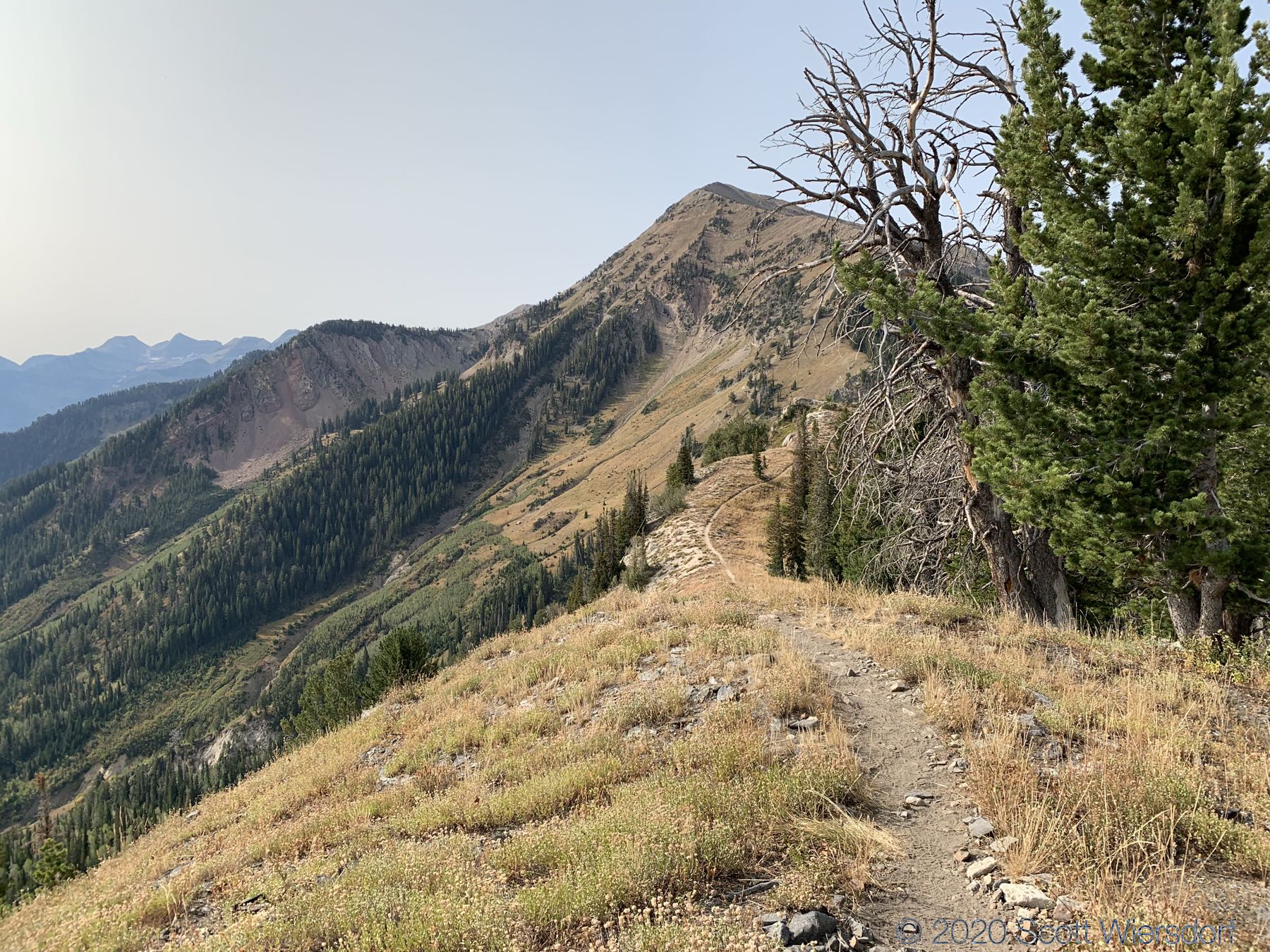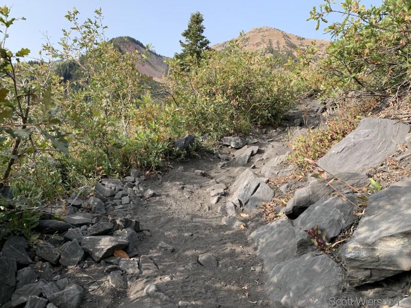 The trail has about the same orientation as the Aspen Grove approach to Mount Timpanogos: facing east and mostly exposed to the sun all day. However, unlike the Aspen Grove approach to Timp, the Box Elder Peak trail has little stands of maples, aspens, firs, and pines that give you some welcome shade roughly every quarter mile or so.