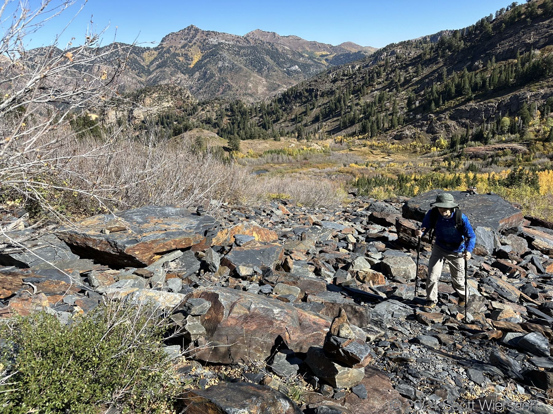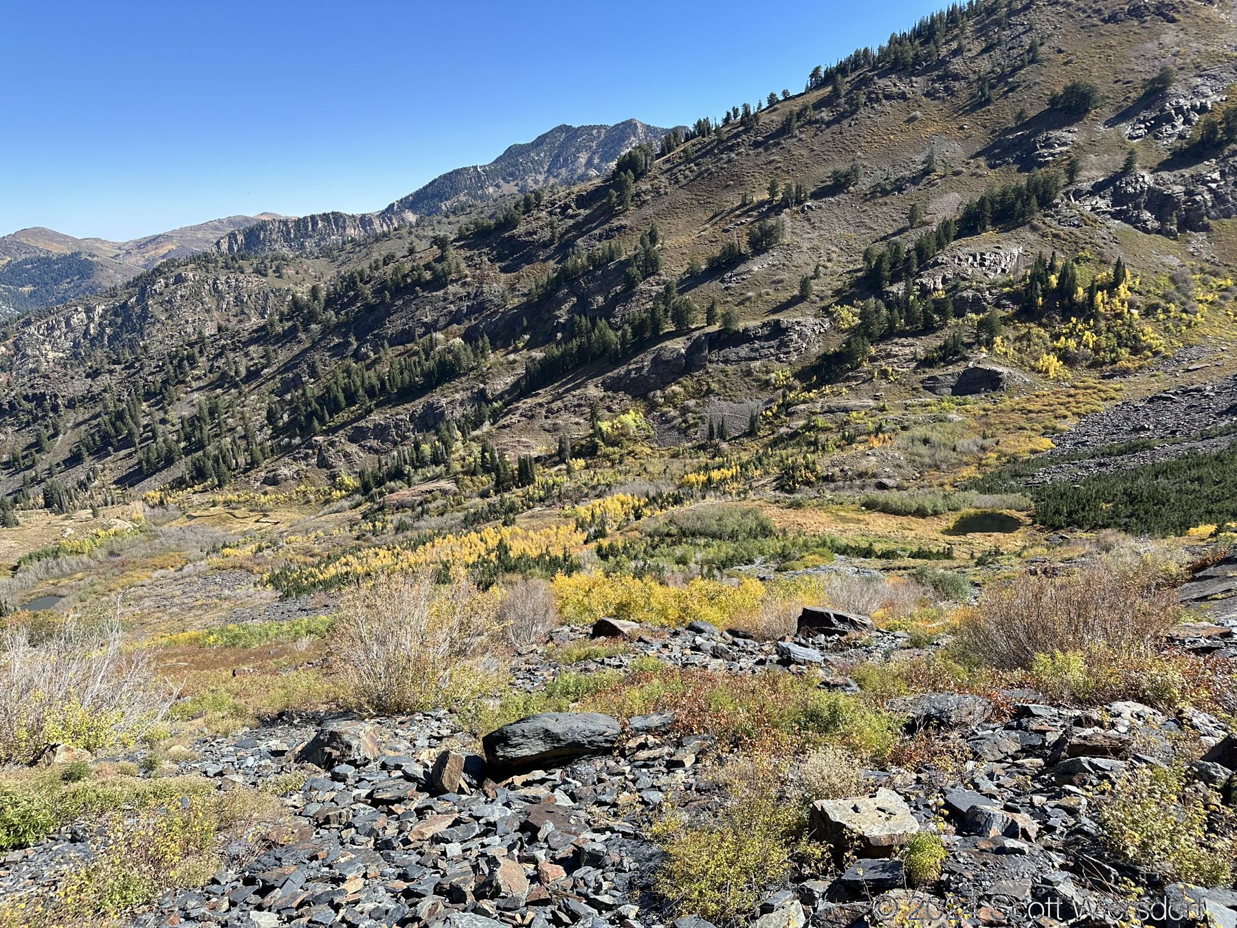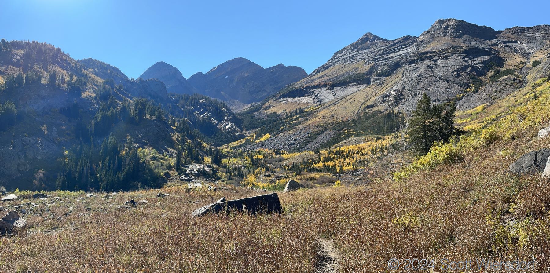 My brother has this peak he wants to summit that’s visible from his office, on the ridge southeast of Storm Mountain and northwest of Twin Peaks. Unfortunately the route options include: Stairs Gulch, Ferguson Canyon, and Broads Fork, none of which go to this ridge (easily). I read about the Robinson Variation in a book that looks like it could work, so we gave it a half-hearted try.