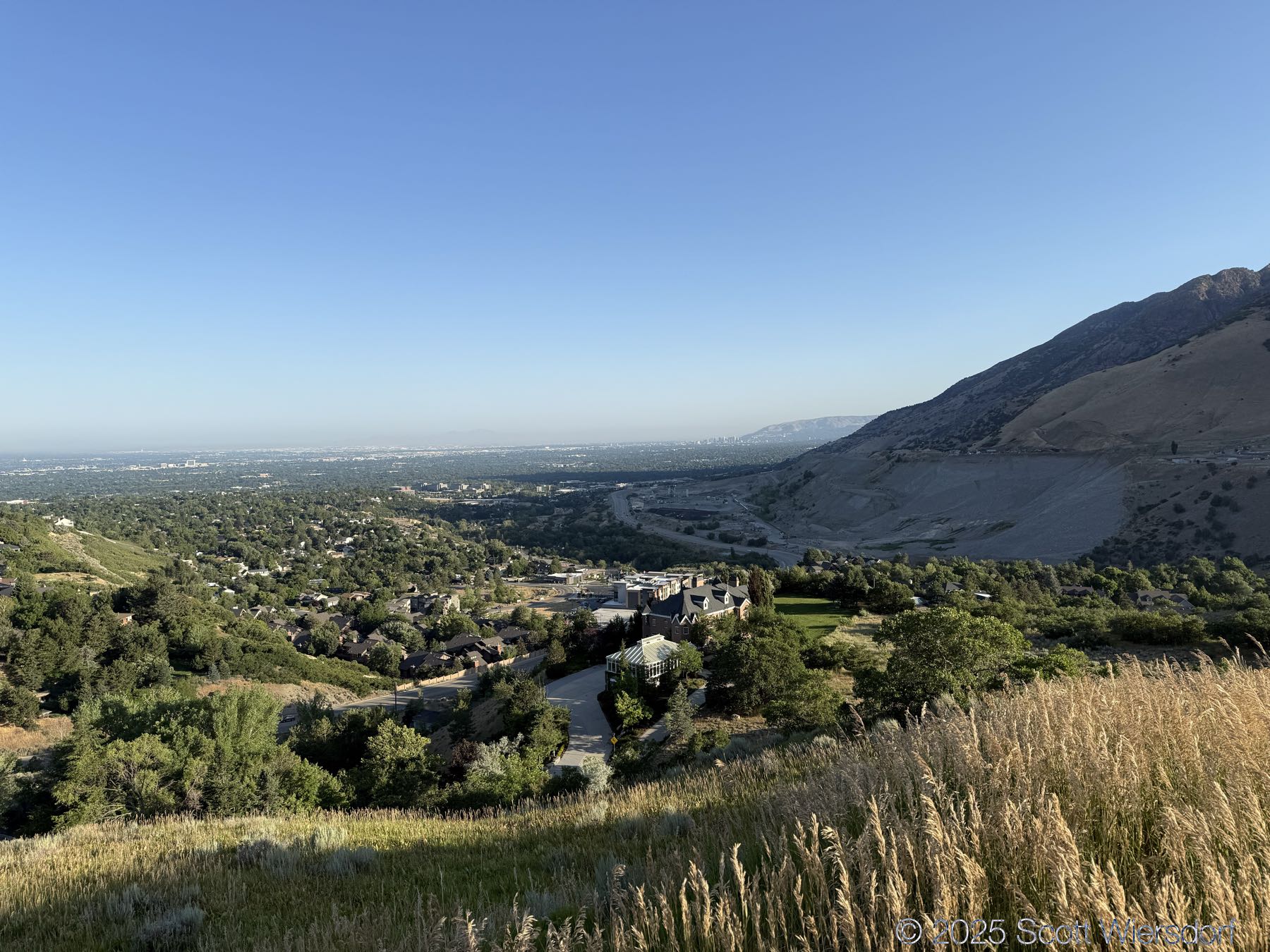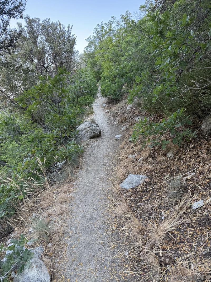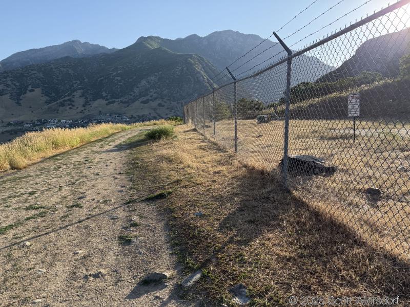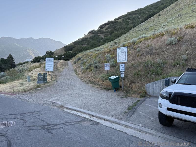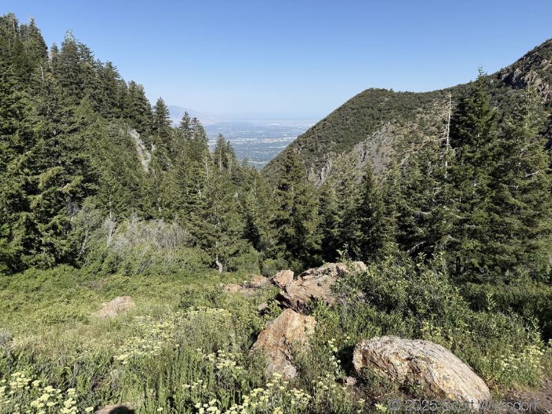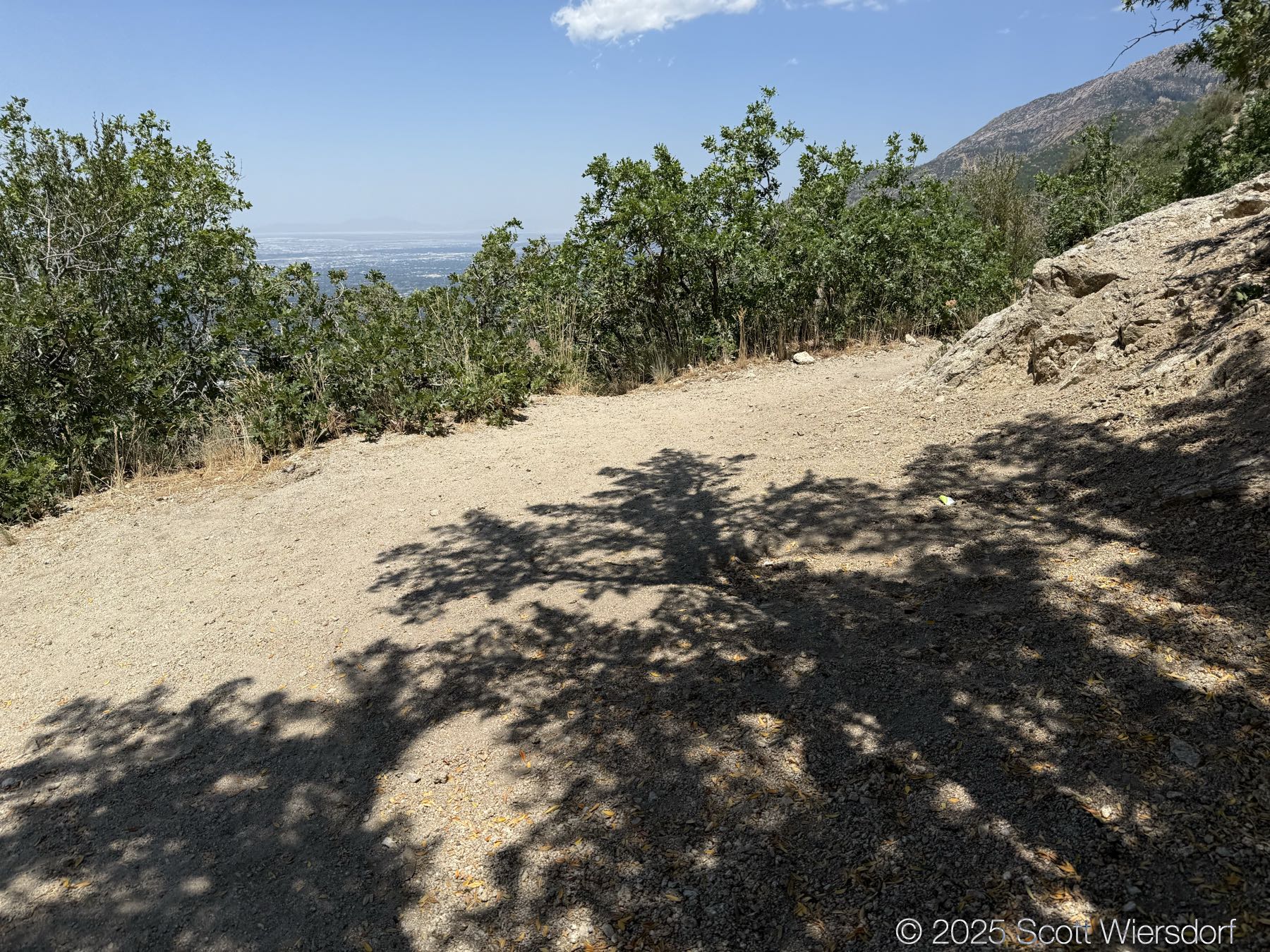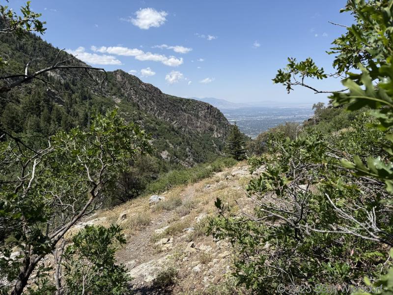 The first quarter mile or so is mostly level or downhill. You’ll pass a water tank with views of the mouth of Big Cottonwood Canyon.