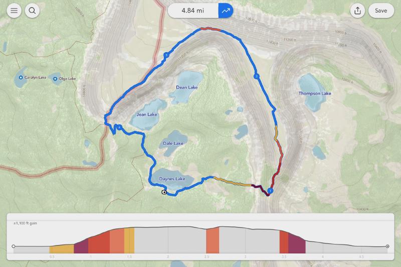 The next day we decided to hike the rim above Four Lakes Basin taking this route: