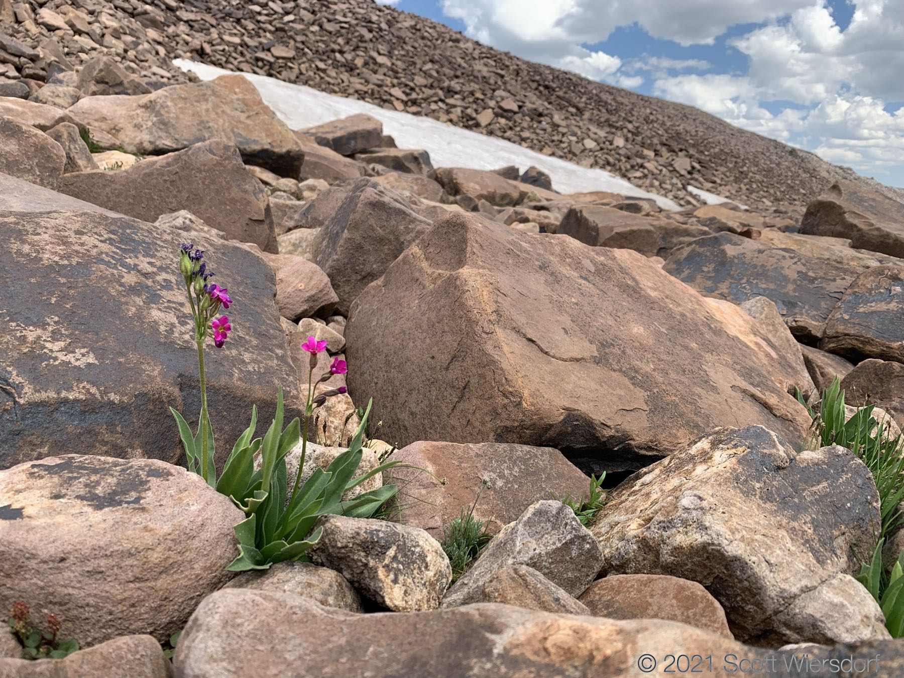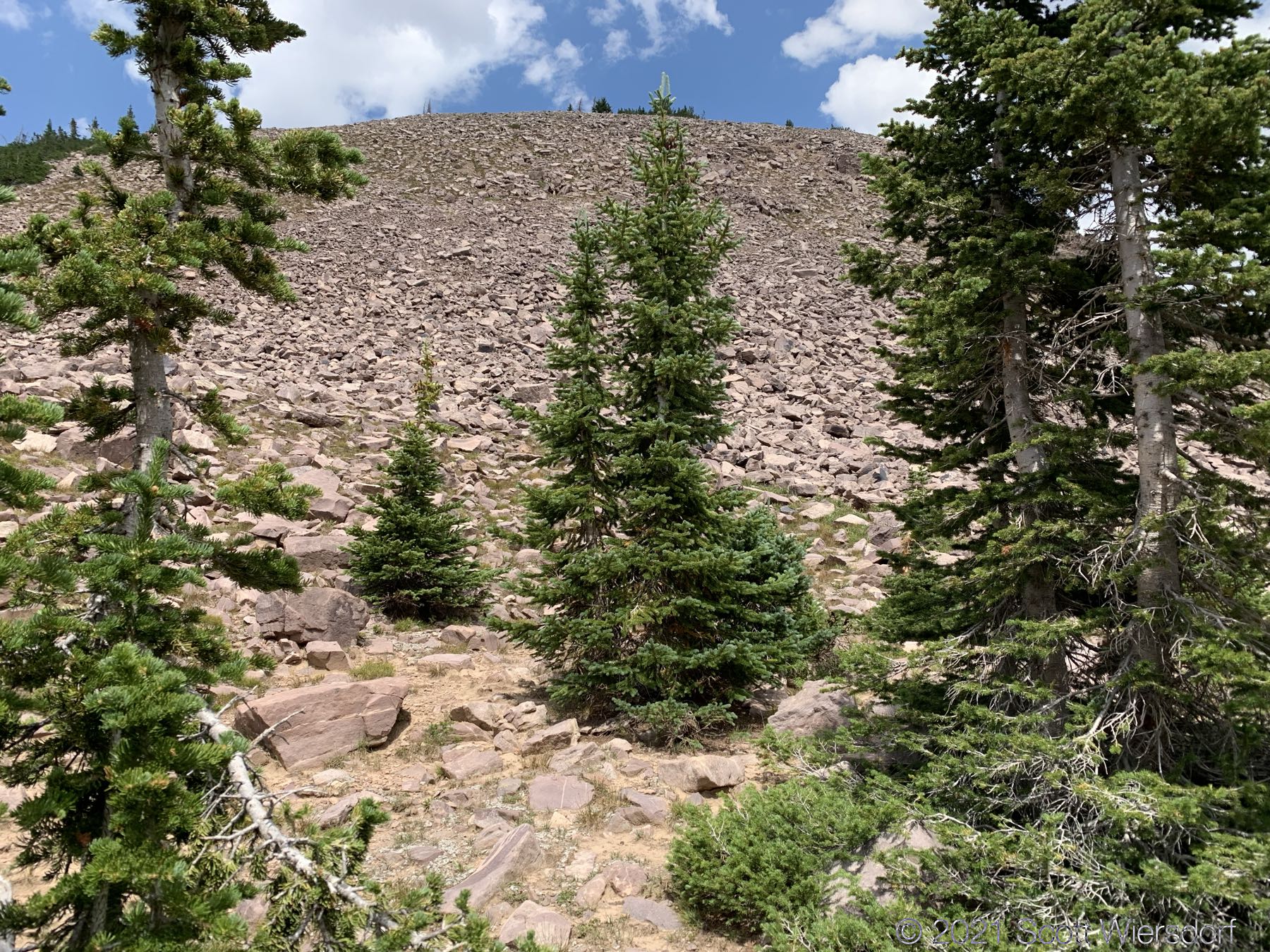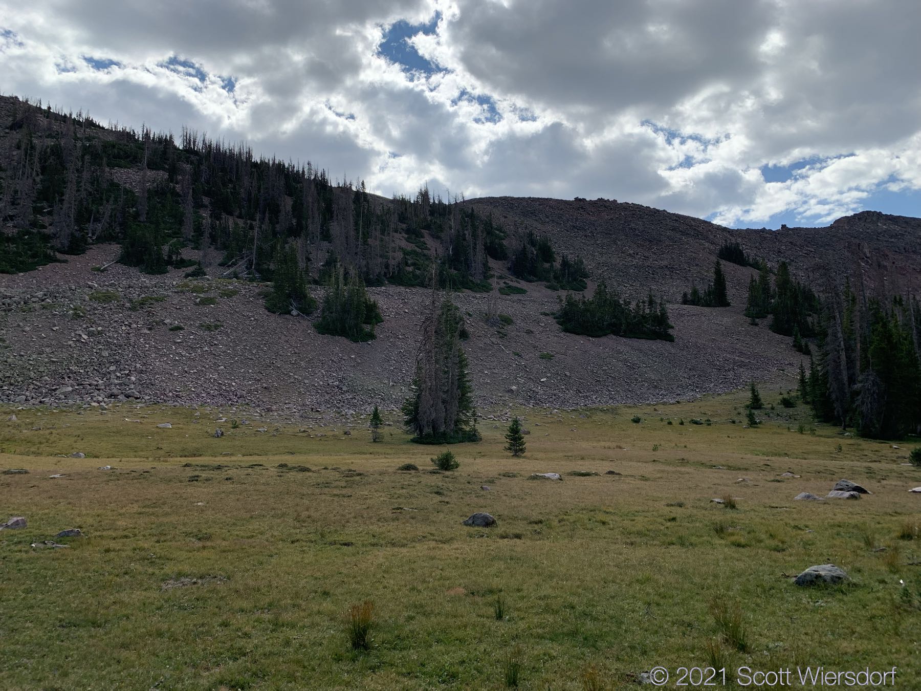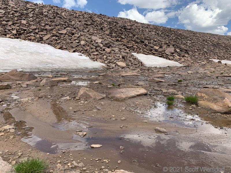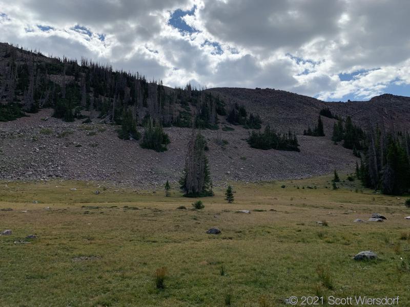 Cyclone Pass is visible on the left as a notch in the ridge where a patch of scrubby pines end. Remarkably, there was a bit of snow left from last year on a south-east facing slope no less: