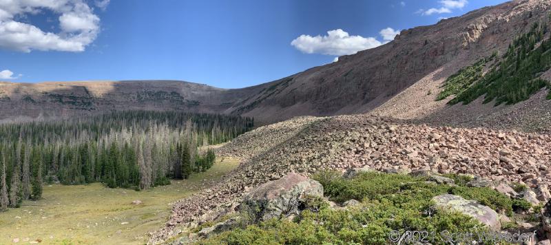 A view of the east-west running ridge, the saddle, and partial view of the the north-south running ridge north of Cyclone Pass: