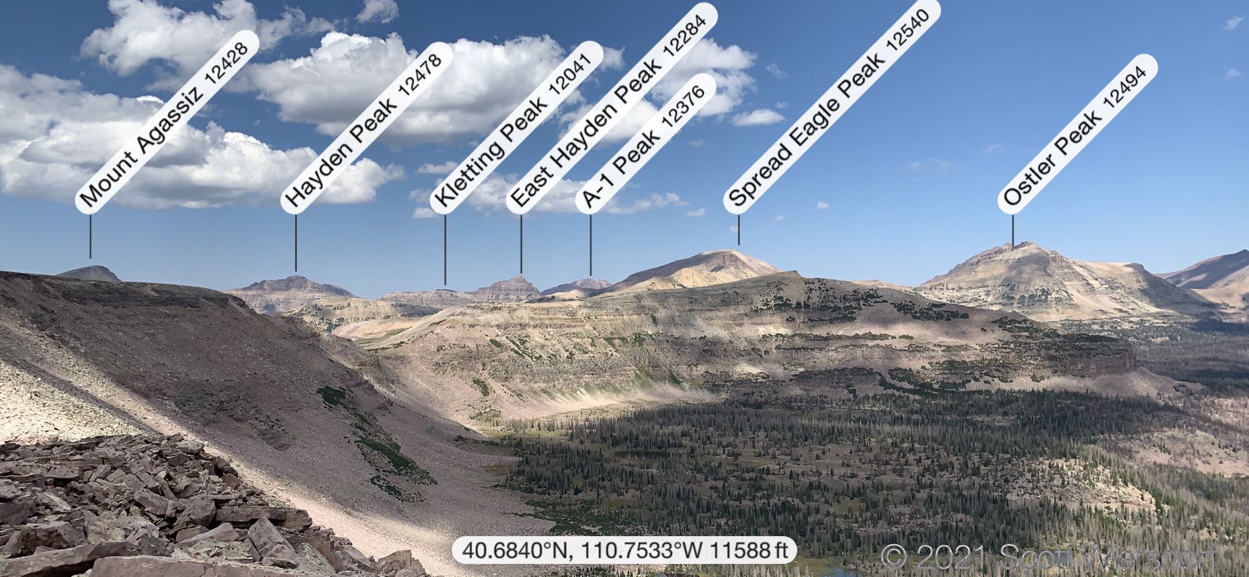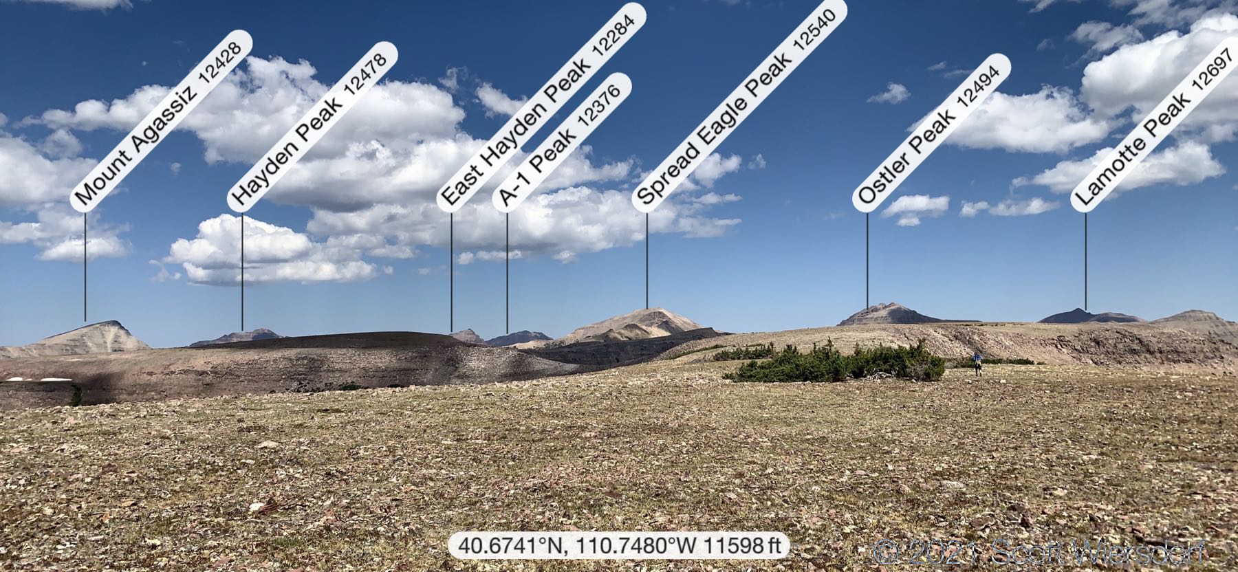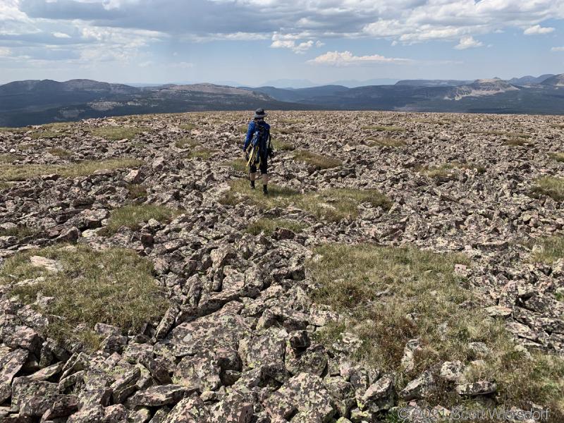 Further along the ridge you have clear views of Rock Creek Basin and Rocky Sea Pass to the north. Rocky Sea Pass and the Highline trail are just visible on the slope between and below Hayden and Kletting Peaks: