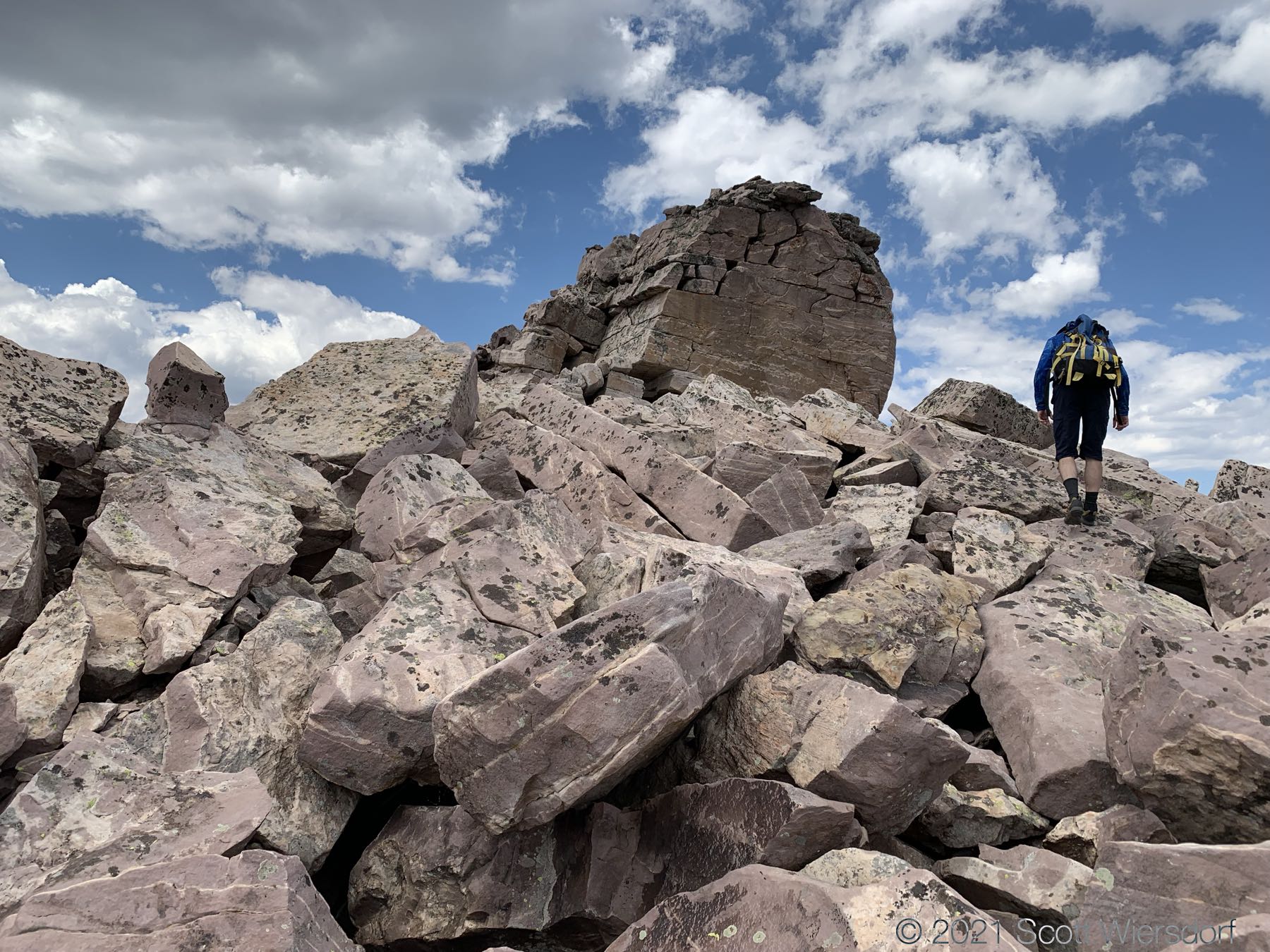 Once you cross the saddle between the north-south running ridge and the east-west running ridge is a large unbroken rock that could provide a lot of shelter in a storm. The saddle between the ridges is a lot of boulder-hopping: