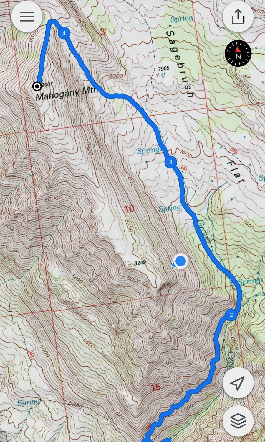 This is a story about a mistake I made in choosing my route up Mahogany Mountain. This was possibly the worst hike I have ever done. The views from the summit were no better than those from Little Mountain or Big Baldy but the route I took was terrible. My main problem was I was piecing together routes from different maps I had seen, thinking, “Surely someone has hiked this obvious direct route before.”