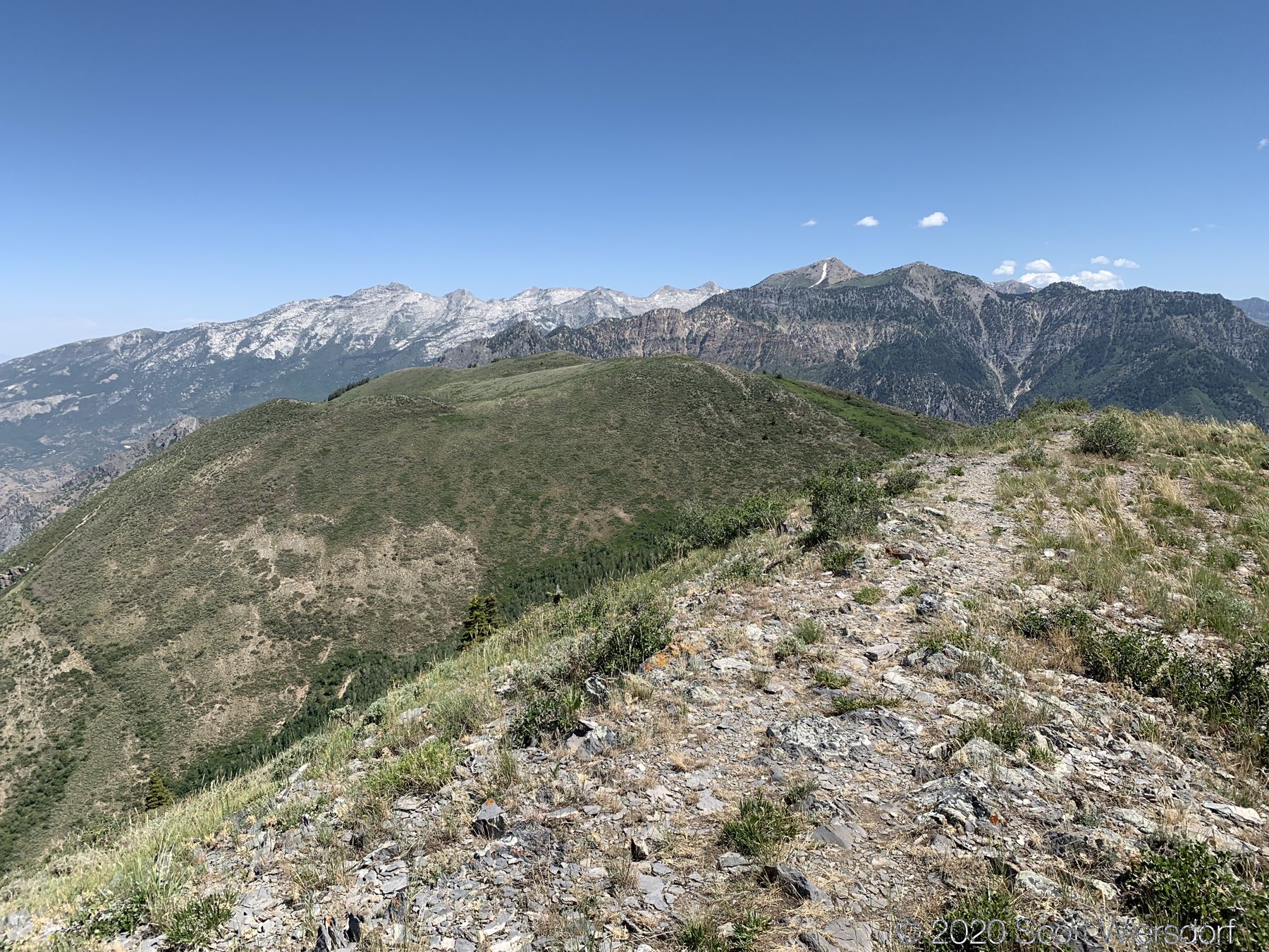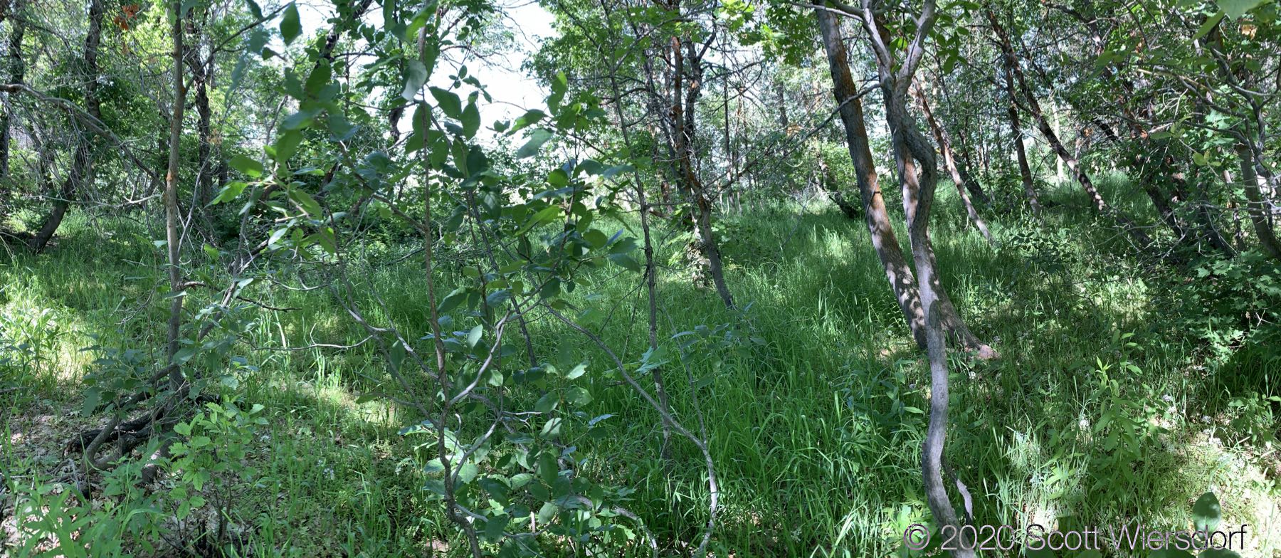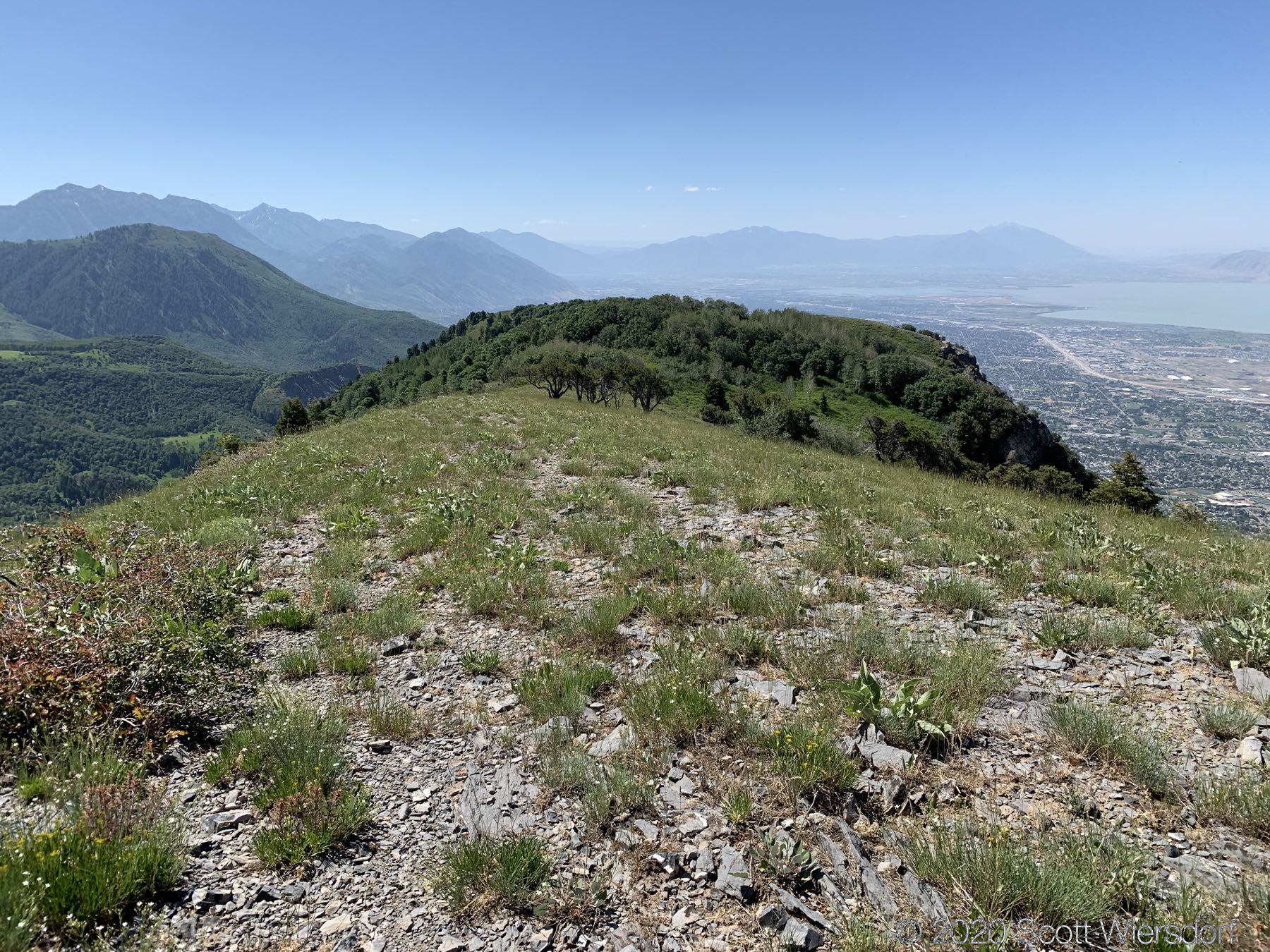 I left the saddle below the peak to the north east and followed a grassy slope about a mile down to where the USGS Topo map indicated the trail should have been. After a mile of grass, the terrain was all bramble (this is a shallow gully just west of Sagebrush Flat):