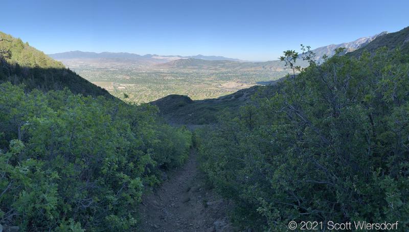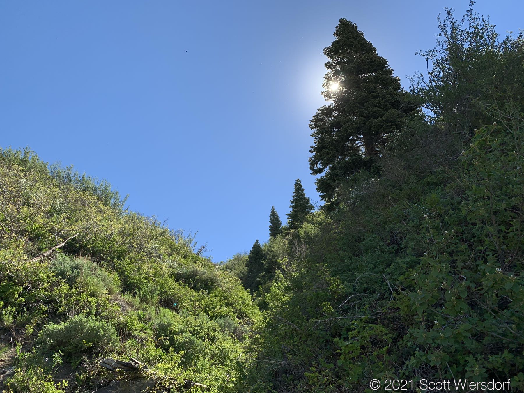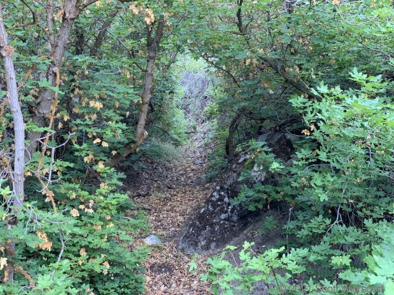The next half-mile to three-quarters of a mile of trail is in the hollow. You’ll pass through high desert junipers, mountain mahogany, and Gambel oak. As you gain elevation and the hollow becomes deeper you’ll see more Rocky Mountain maples along the trail. This part of the trail, while not maintained, is in good shape and easy to follow. Plan to get whipped in the face with some of the trailside shrubbery. Through most of this hike, I found the underbrush was the main source of frustration.