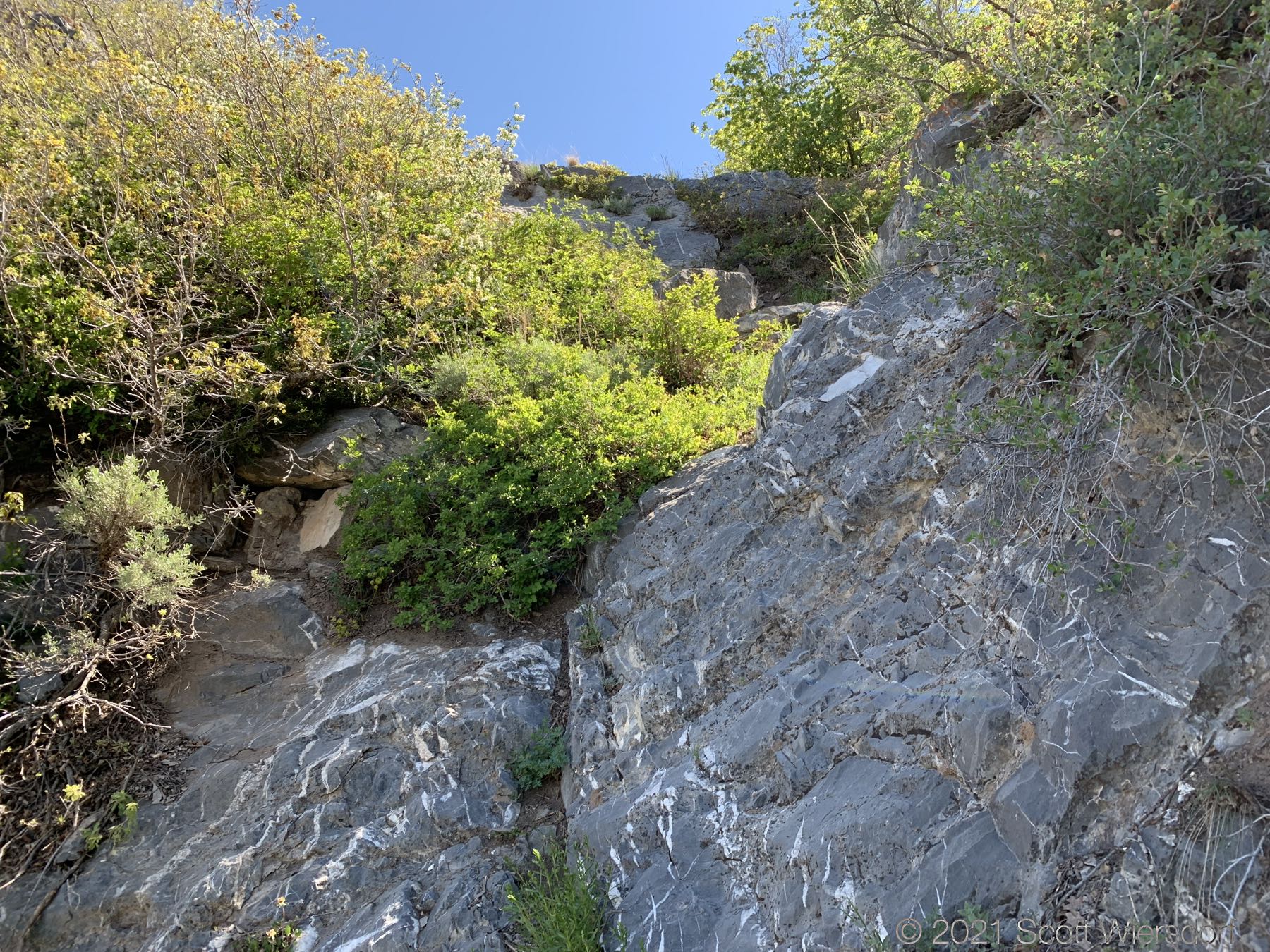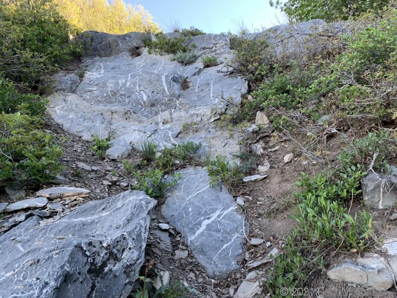 In this section (about 7500’ elevation) you will scramble up a few exposed limestone outcroppings. Nothing dangerous here: these are not high and there are plenty of foot and handholds.
