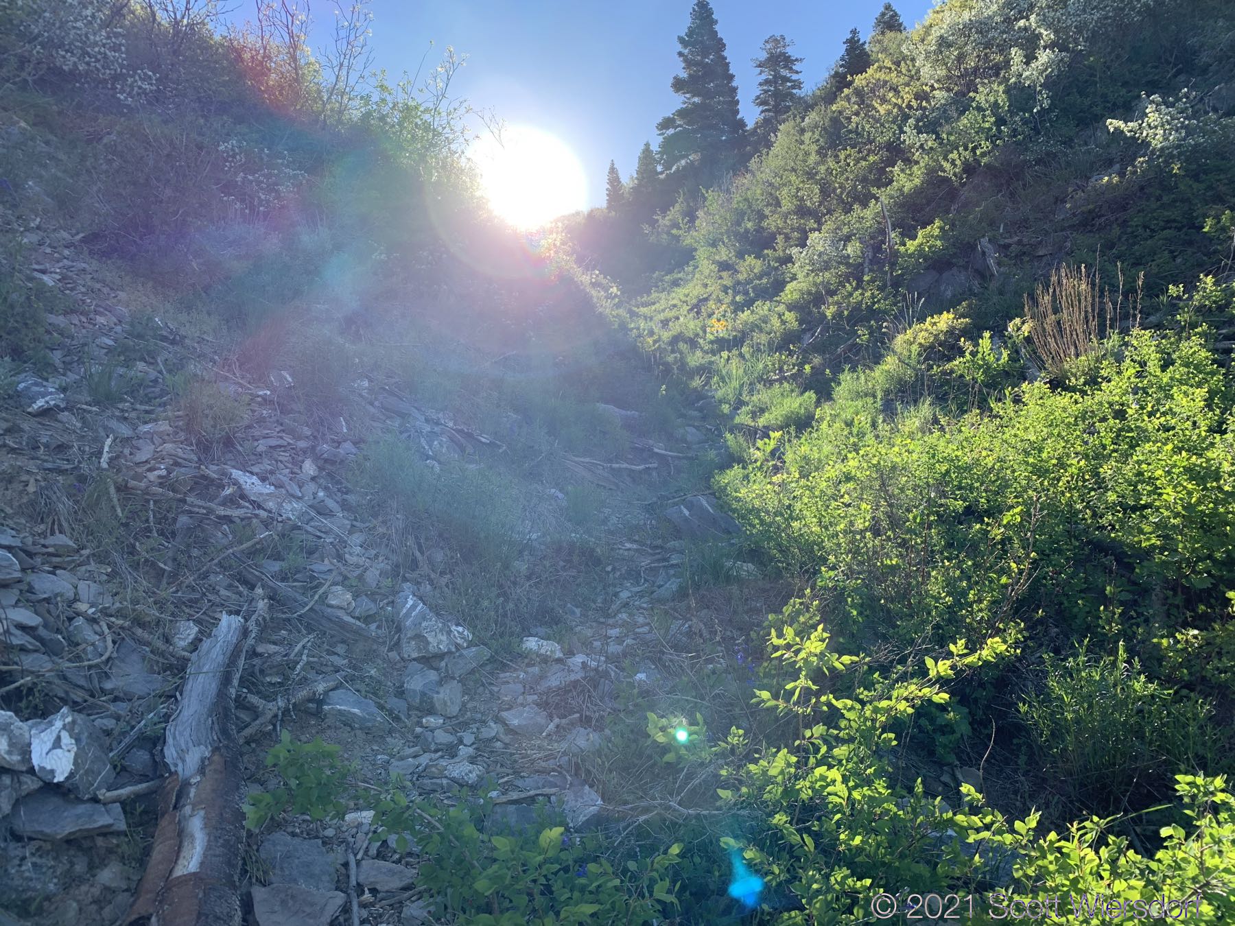 At about 1.6 miles this slope trail will drop back into the hollow. For the next almost half-mile you’ll be in the bottom of the hollow stumbling along aspen trunks and limbs that have been carried down from the top by winter avalanches in past years. Some of these trunks are slick, some will roll, some will snap under your weight, some will snag you as you pass: it’s a cornucopia of uncertainty!