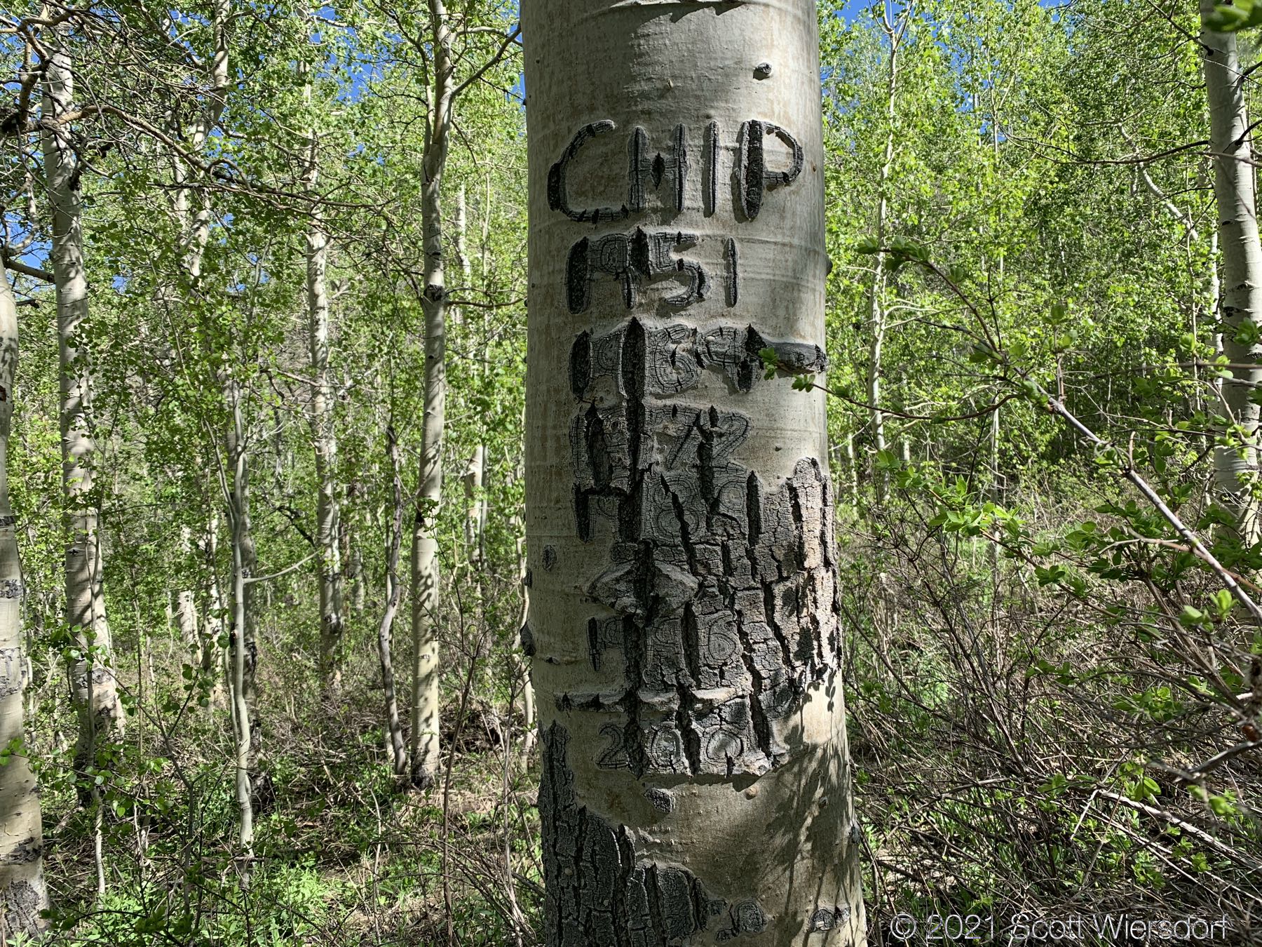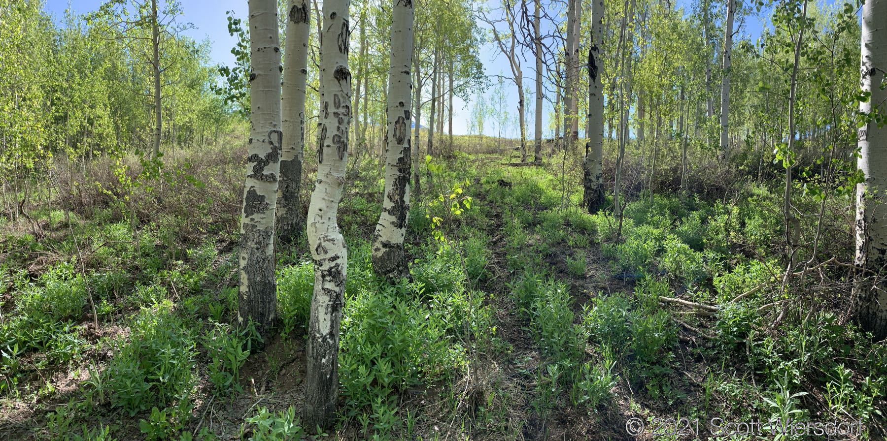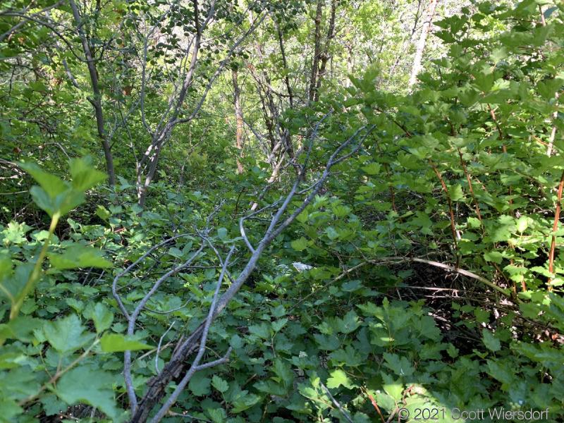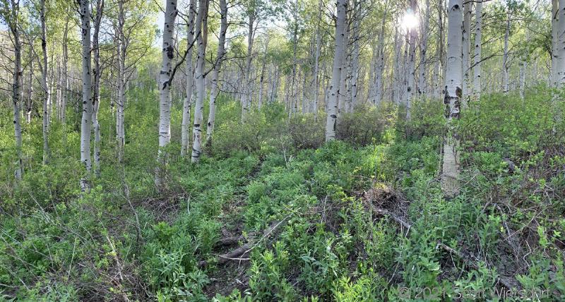 At about 1.9 miles up the “trail” (I must use quotes here now to denote a private joke about the whole situation that isn’t funny) you’ll reach a large aspen stand. You will be in this stand until you arrive at the saddle below Mahogany Mountain. The trail in this stand is gone. You’ll be deceived by deer trails that look promising, then lead away up the slope in the wrong direction. The underbrush was thick for early June (the snow has only been gone a few weeks) and I can only imagine it getting worse as the summer goes on.