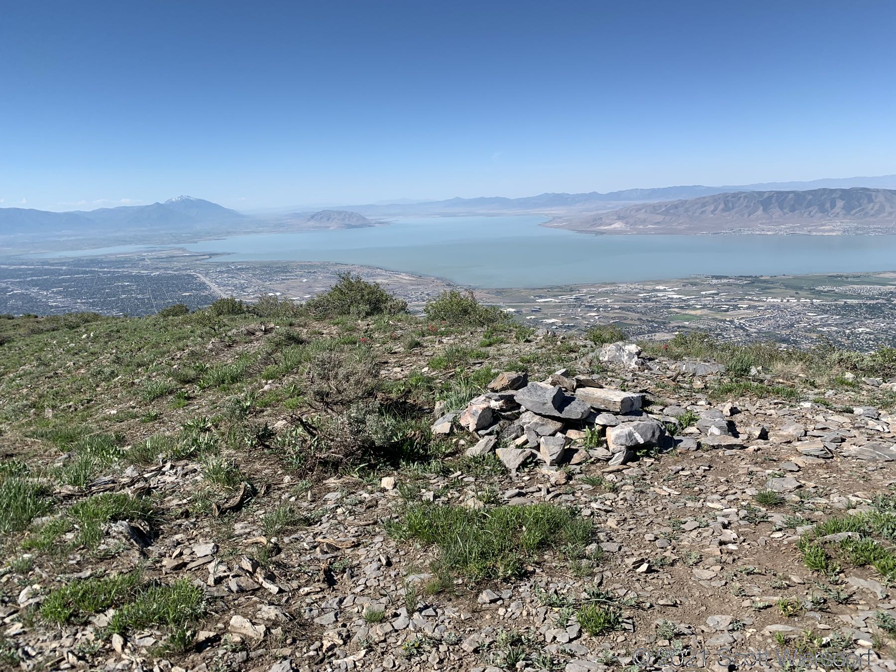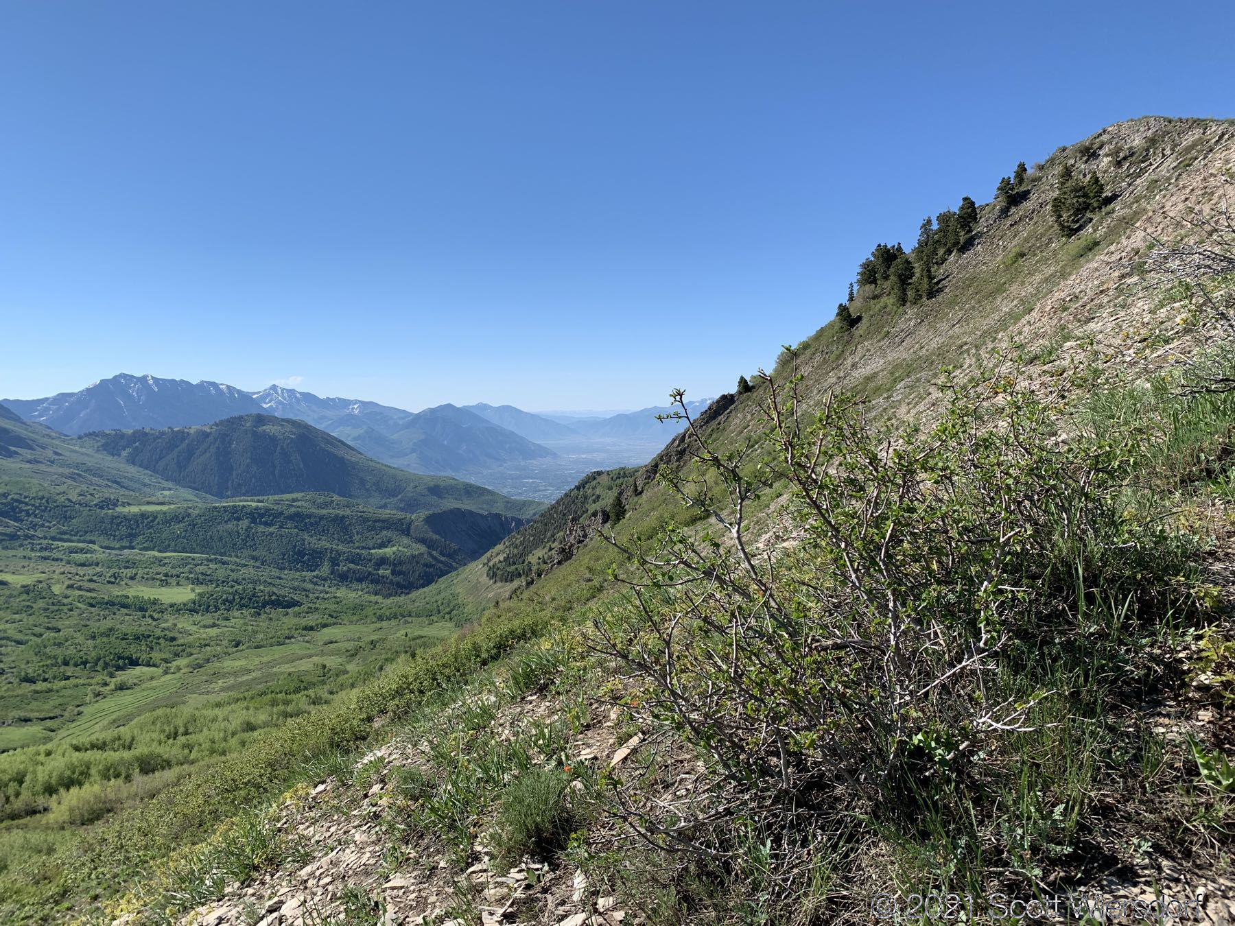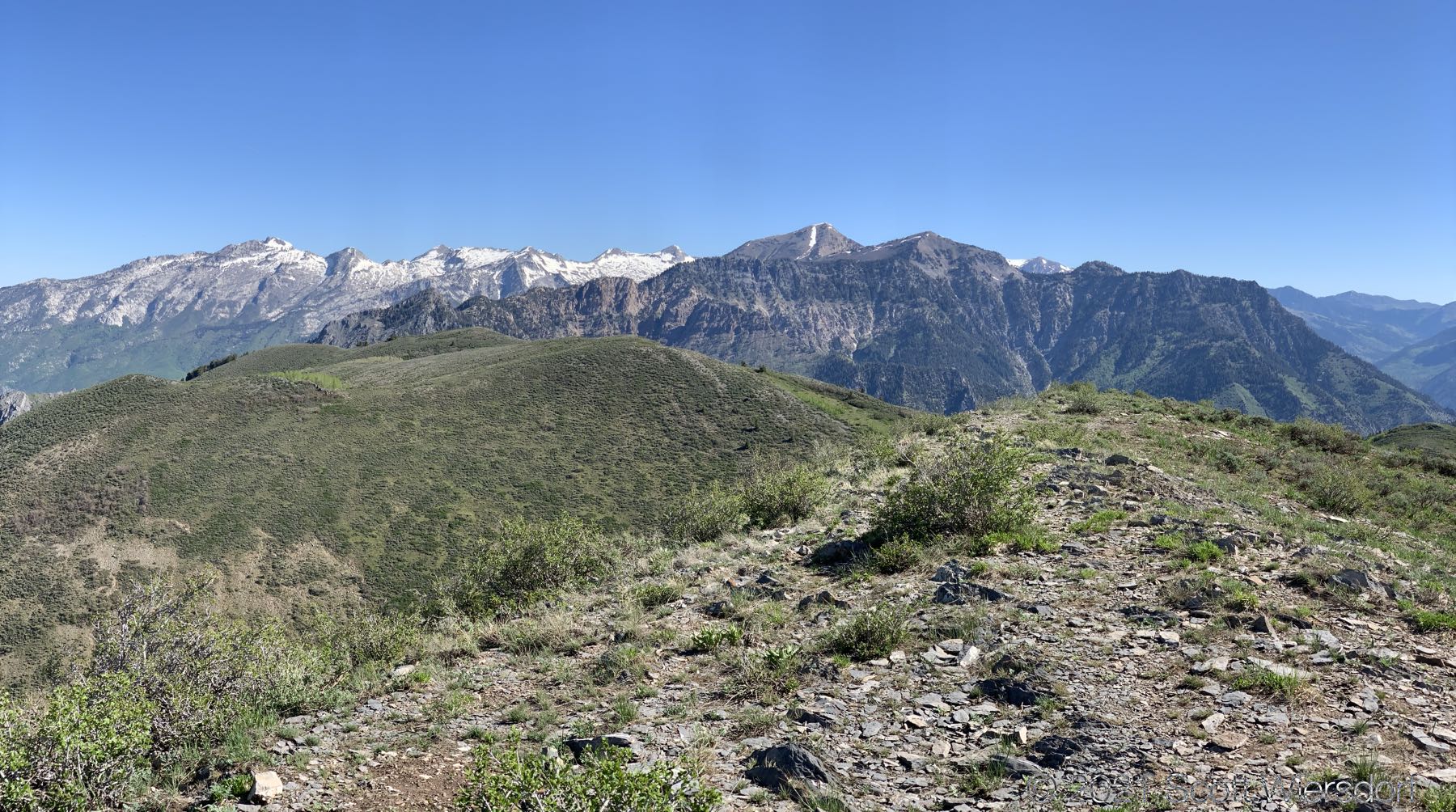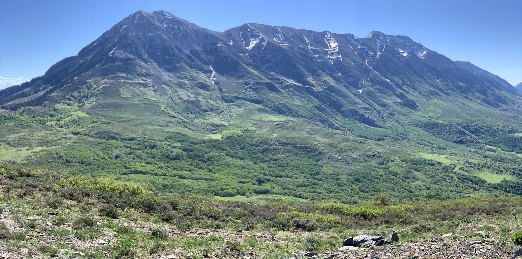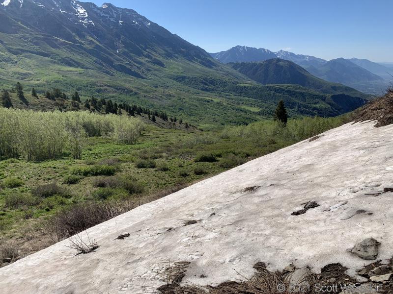 However, once you clear the aspens, you’re just a quick skip up the ridge to the top. This part of the trail is easy to find and follow. There was still a bit of snow on the north-east slope of Mahogany Mountain just above the saddle to the south (yes, I threw a snowball):