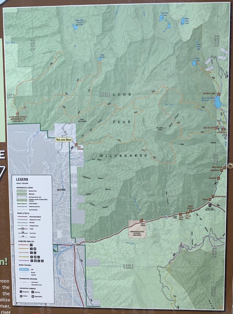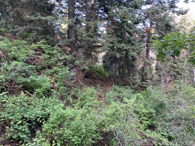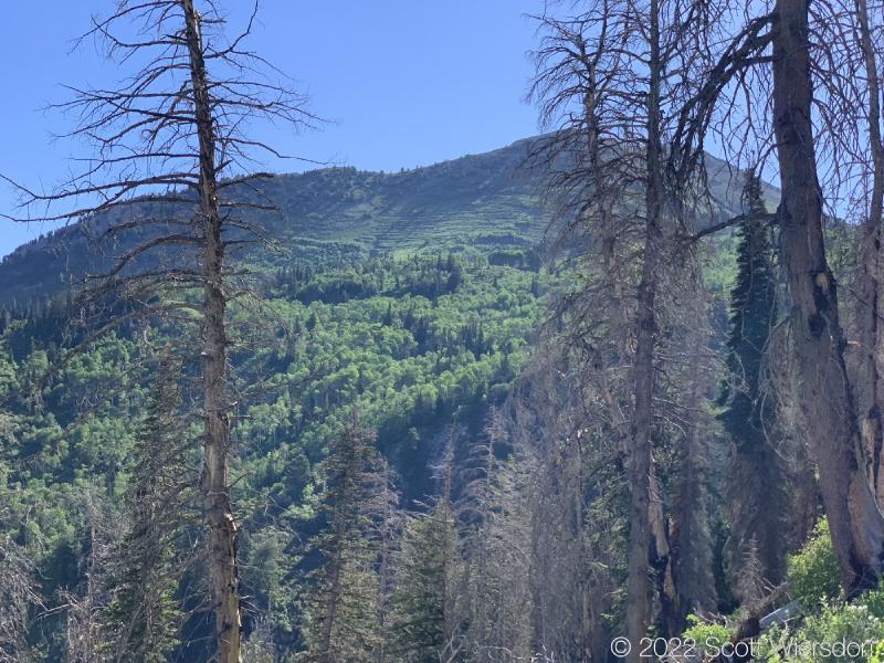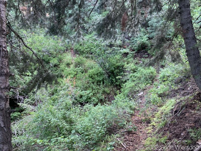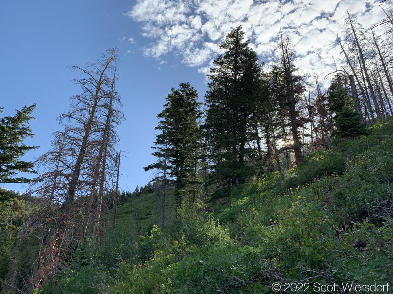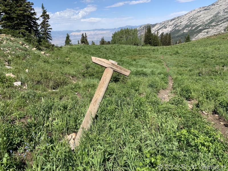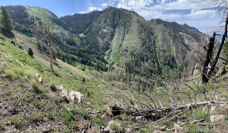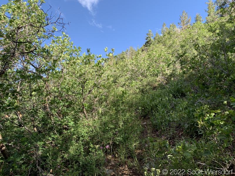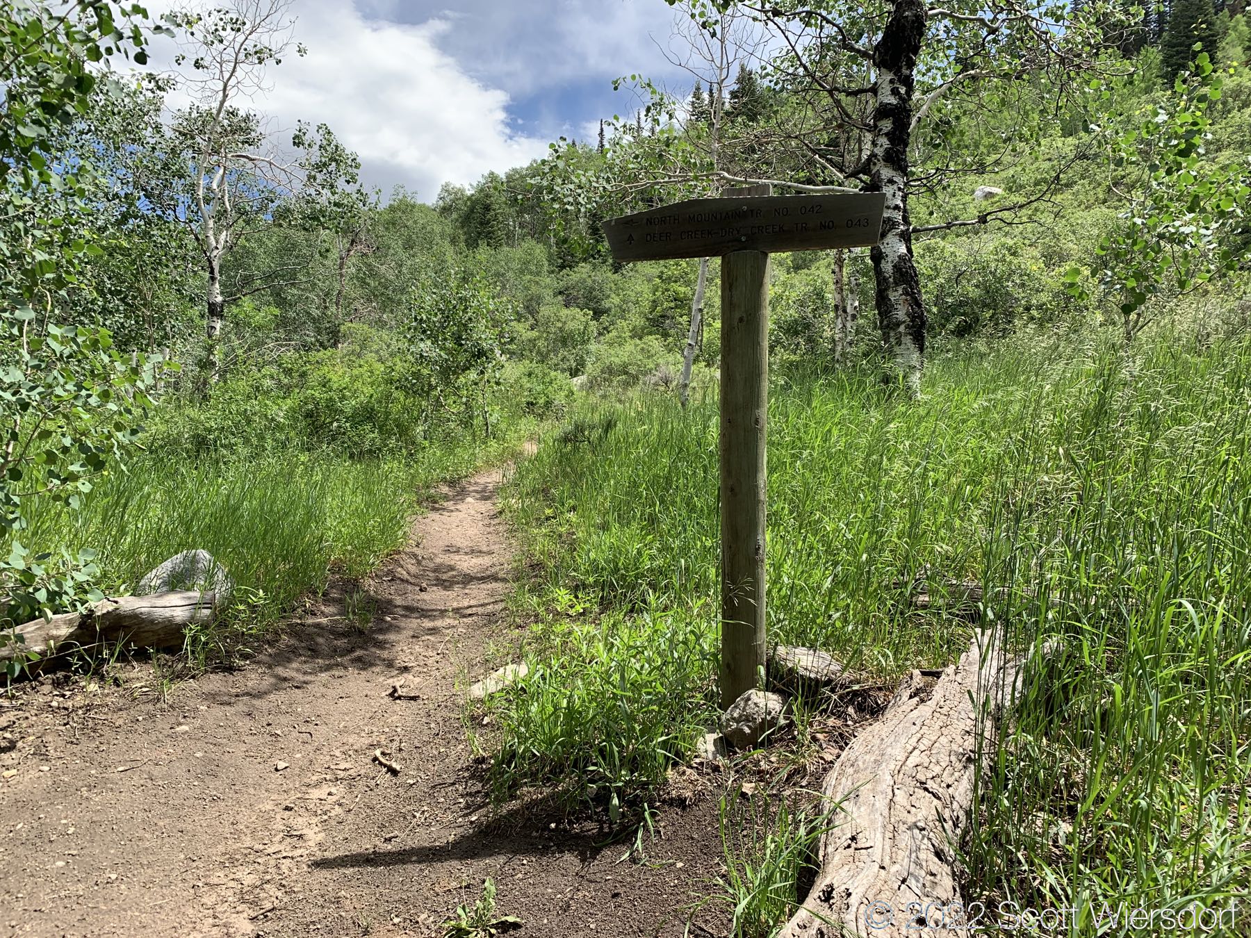 The trailhead is accessed from the Deer Creek-Dry Creek Trail (#043) . There is a post about 0.38 miles from the trailhead that indicates the junction with the Phelps Canyon trail (#046) . The post looked like it was a sign once upon a time, but it appears that trail #046 is no longer maintained by the Forest Service (I could find no mention of it on the Pleasant Grove Ranger District website), possibly since the Phelps Canyon fire in July 2012 . That trail closure will be important to understand later.