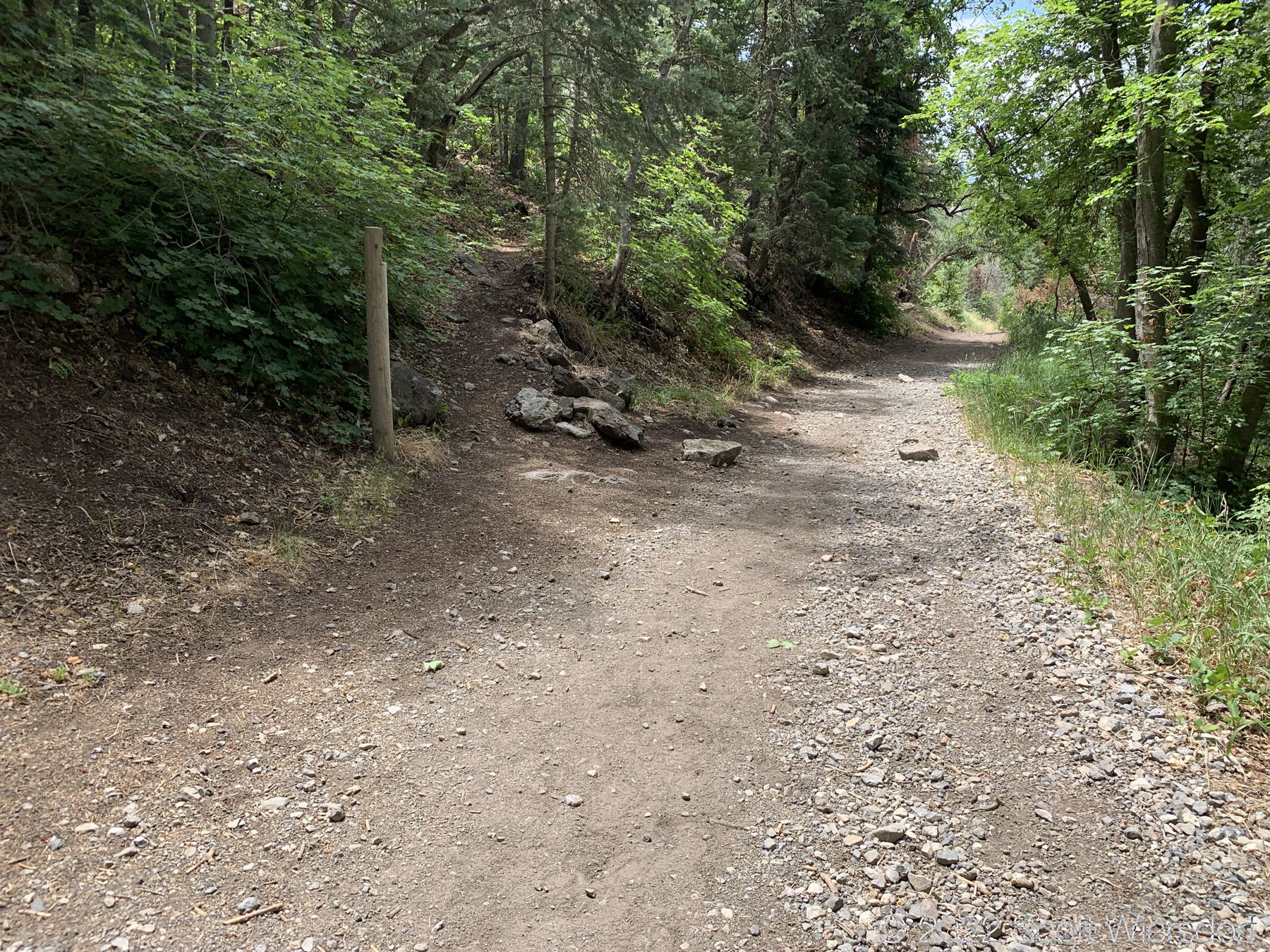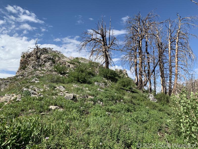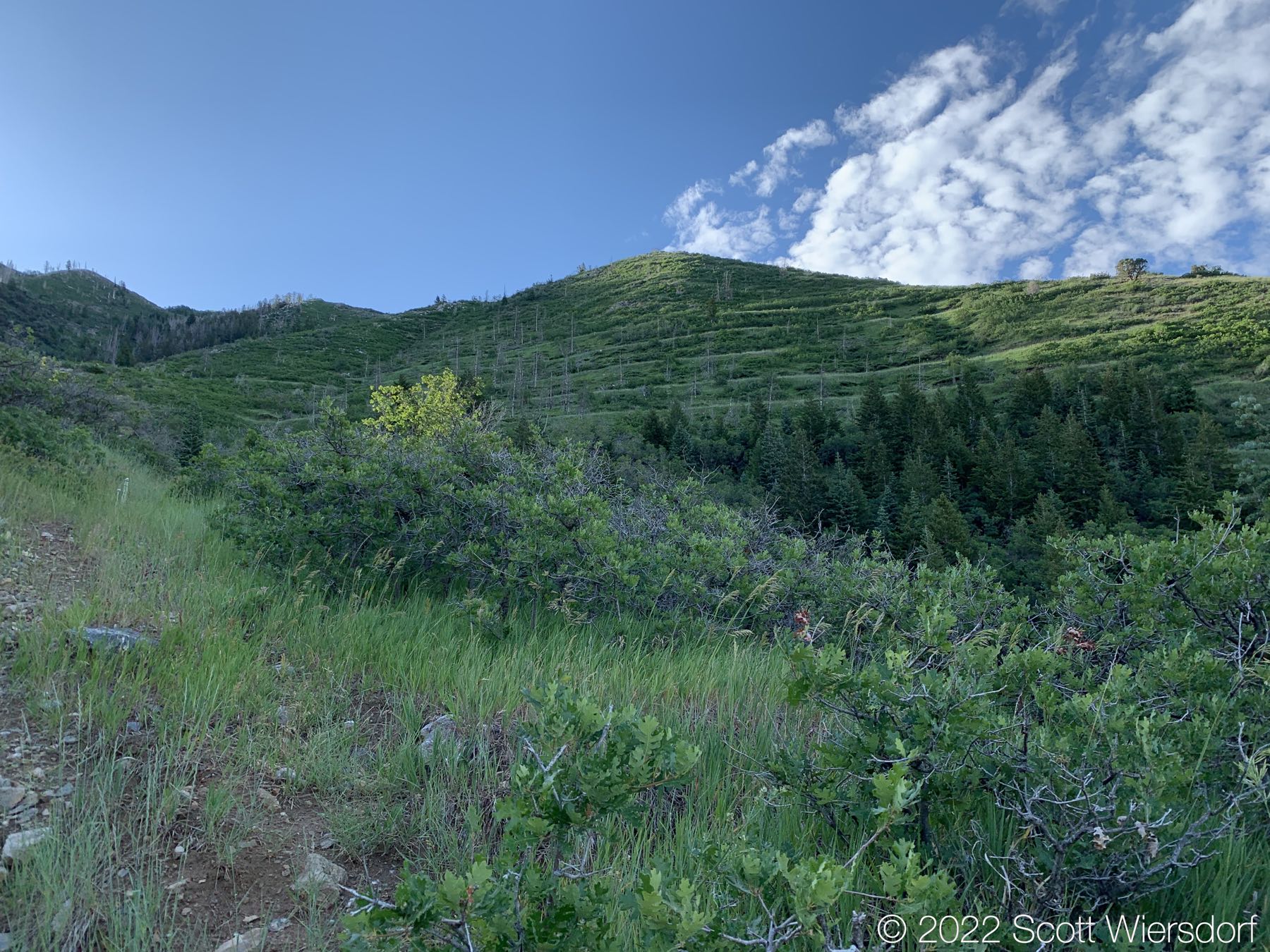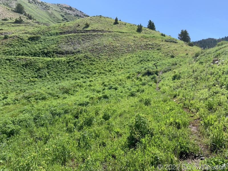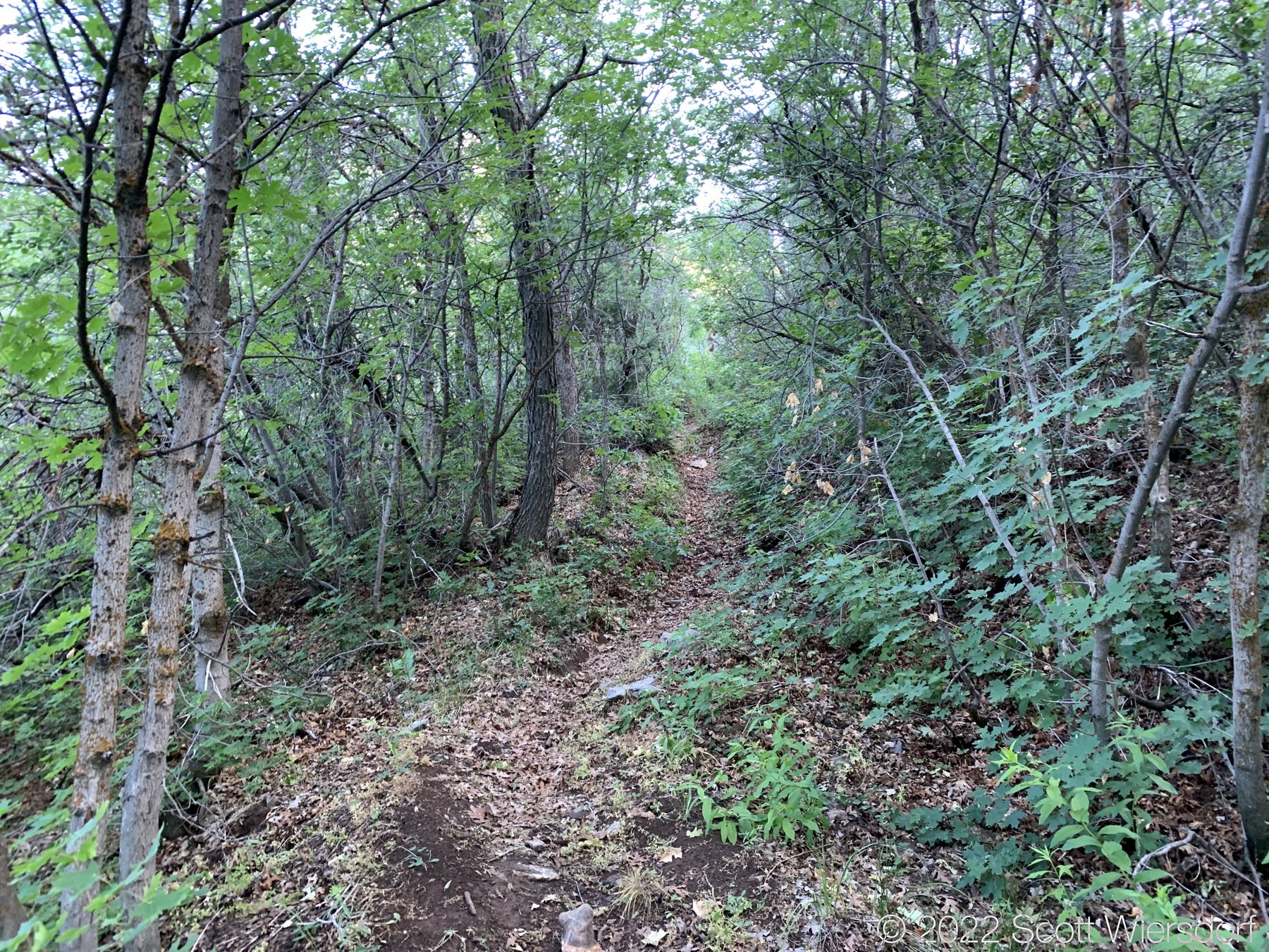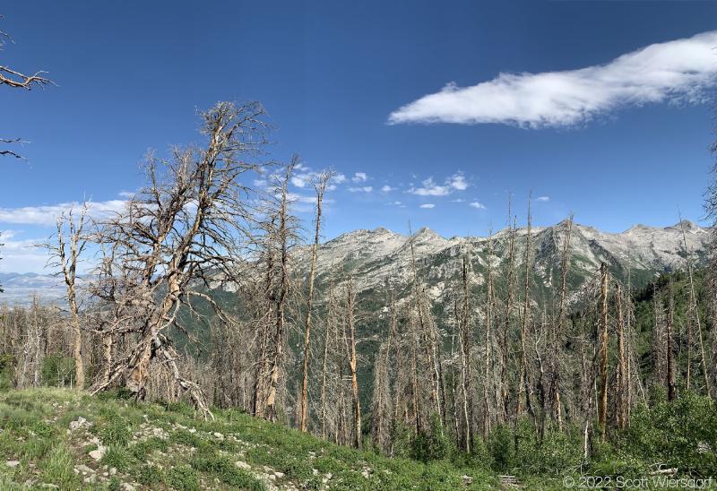 The trailhead is accessed from the Deer Creek-Dry Creek Trail (#043) . There is a post about 0.38 miles from the trailhead that indicates the junction with the Phelps Canyon trail (#046) . The post looked like it was a sign once upon a time, but it appears that trail #046 is no longer maintained by the Forest Service (I could find no mention of it on the Pleasant Grove Ranger District website), possibly since the Phelps Canyon fire in July 2012 . That trail closure will be important to understand later.