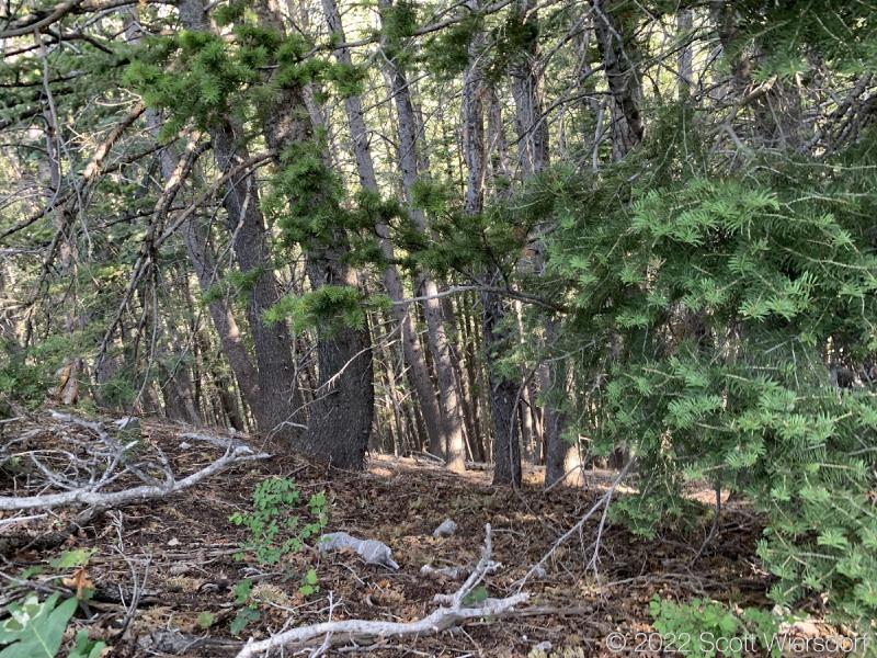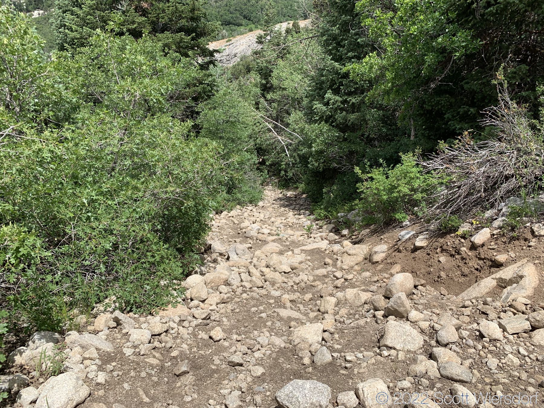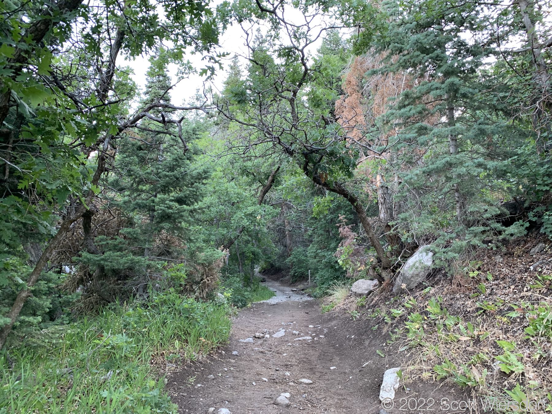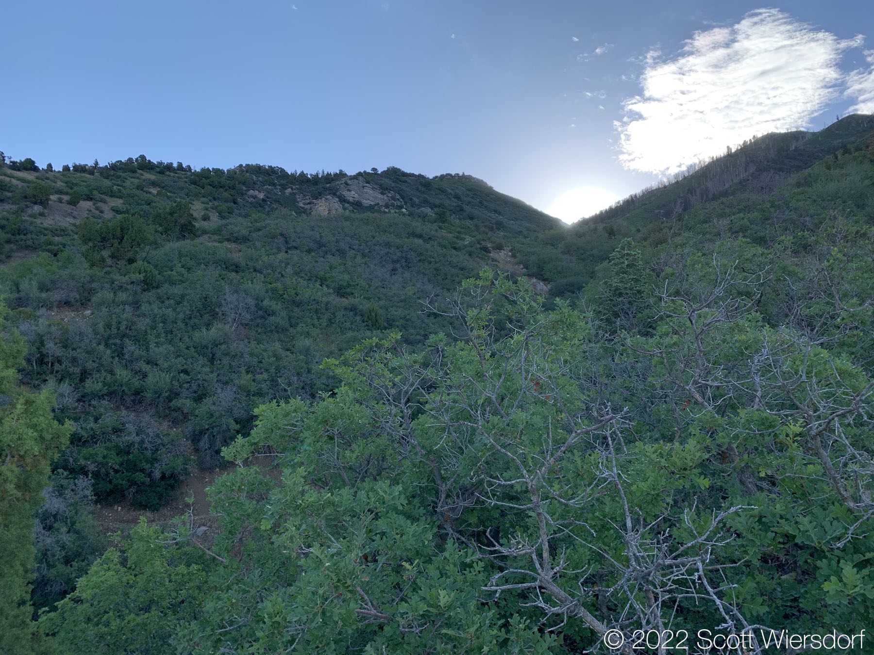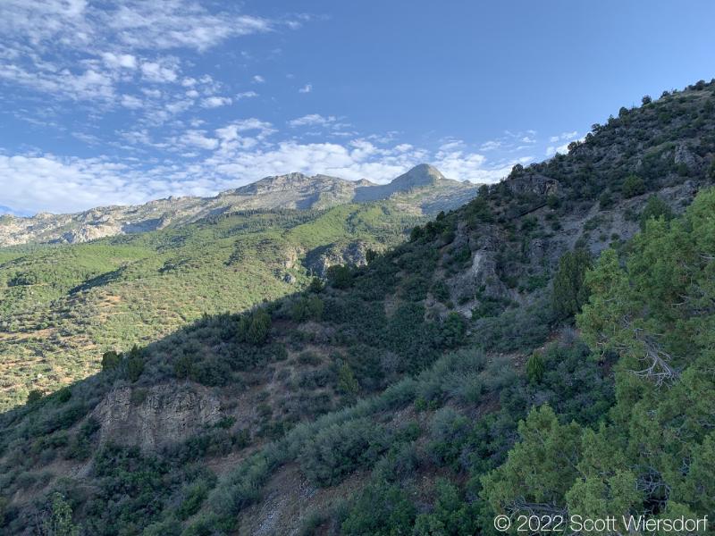 The trailhead is accessed from the Deer Creek-Dry Creek Trail (#043) . There is a post about 0.38 miles from the trailhead that indicates the junction with the Phelps Canyon trail (#046) . The post looked like it was a sign once upon a time, but it appears that trail #046 is no longer maintained by the Forest Service (I could find no mention of it on the Pleasant Grove Ranger District website), possibly since the Phelps Canyon fire in July 2012 . That trail closure will be important to understand later.