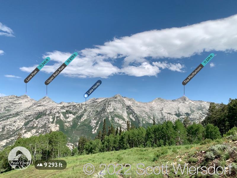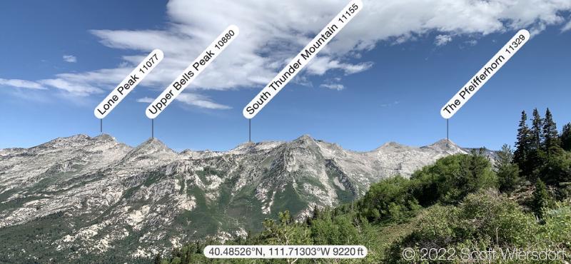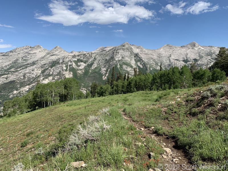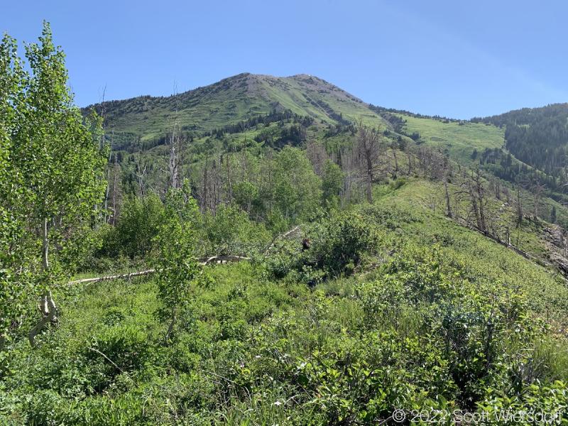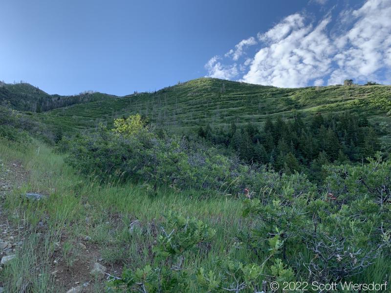 While the trail had disappeared and the hike turned into a bushwhack, it was a pretty bushwhack as far as bushwhacks go. Great view of the Little Cottonwood Canyon ridgeline.