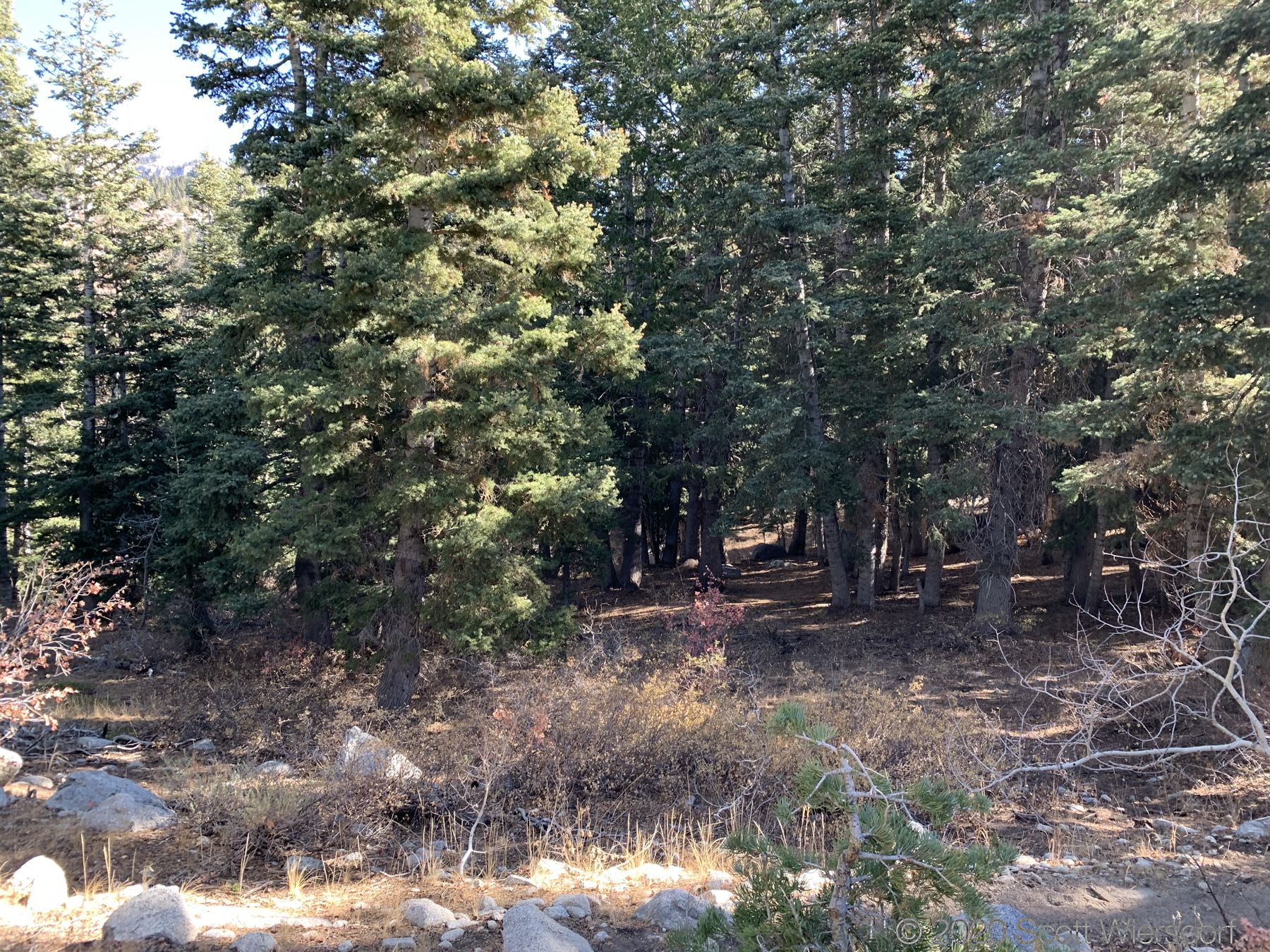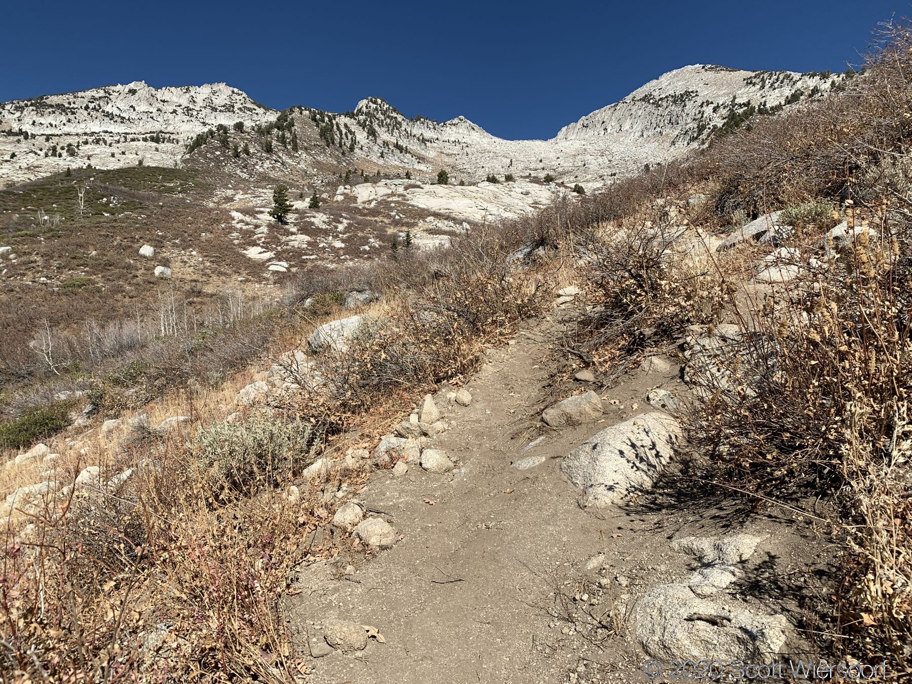 The trail from the trailhead to First Hamongog is generally southwest facing with few opportunities for shade. The next mile of trail is a 20–30% grade. At about 7500 feet (maybe 2.25 miles in) you’ll start to get into some conifers along the trail.