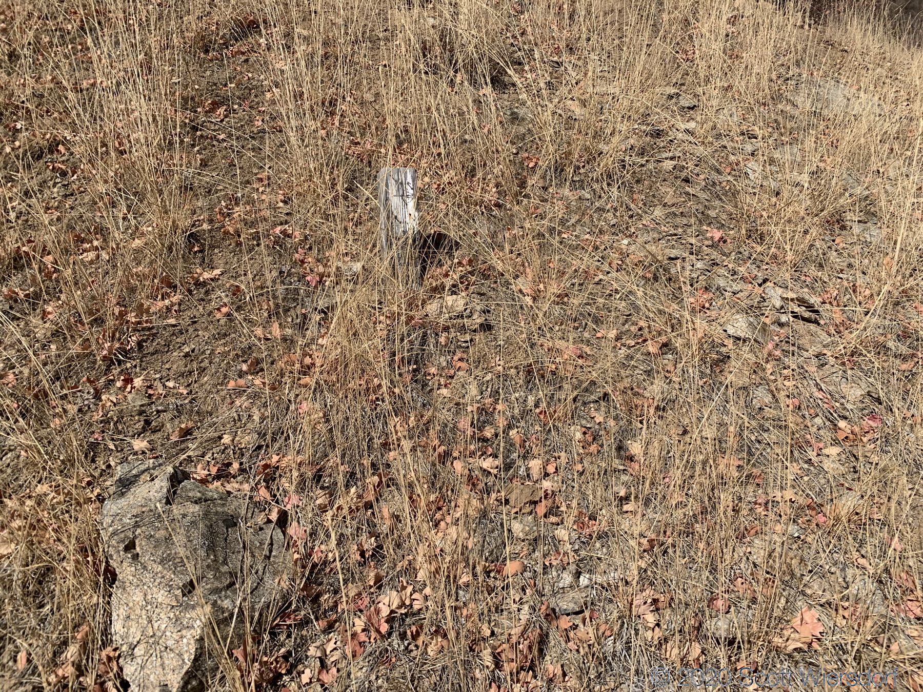 After passing this gate, the first mile of the trail is a dirt service road (no motorized vehicles). You can stay on the road (adds .25 miles) or follow a trail that shortcuts the service road switchback. The trail leaves the road at a switchback and isn’t clearly marked other than a small post with some nails or screws in it: