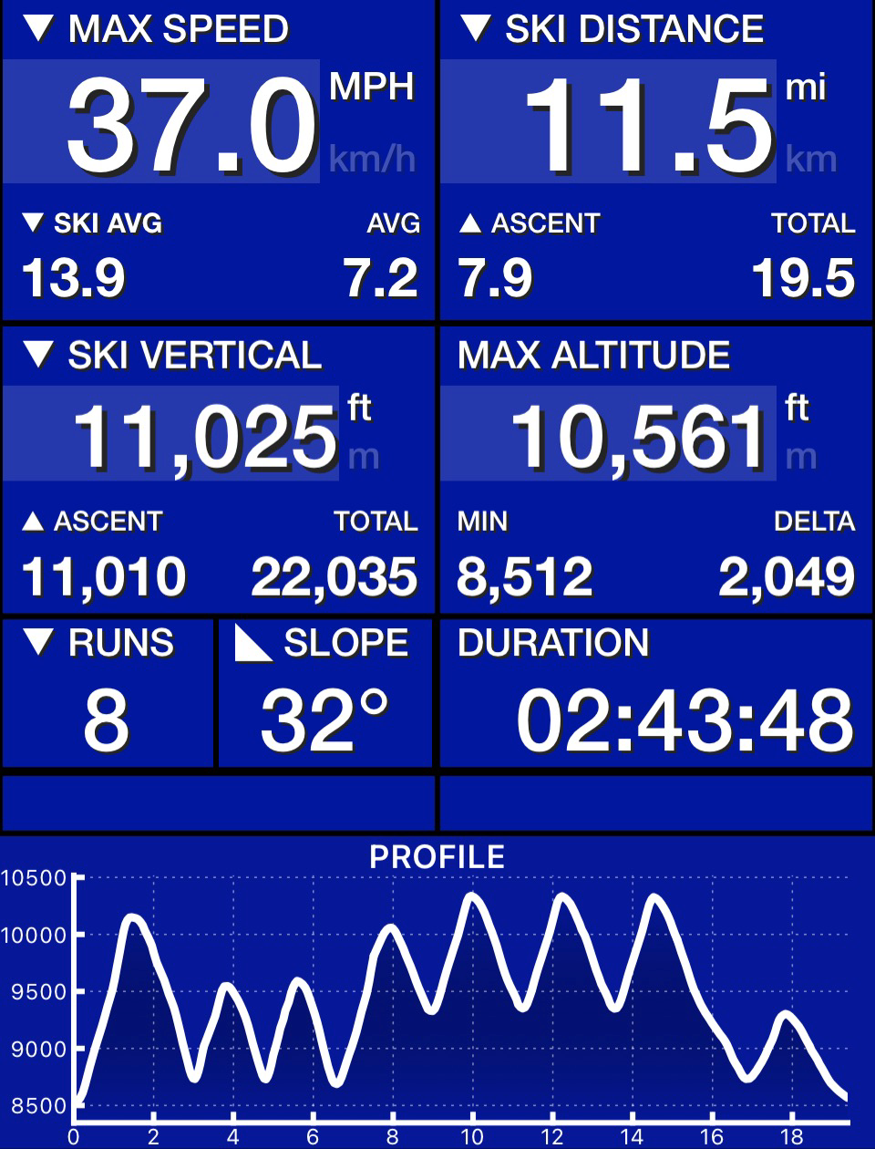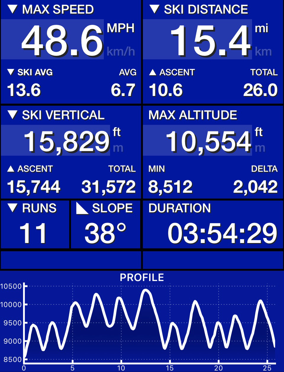 A day with my brother Jason. We had so much fun honing our mogul skills. The weather was warm, so anything below 9500 feet was soft and squishy, but we found the Devil’s Castle traverse open and the snow was still powder for a few hundred vertical feet. So nice.